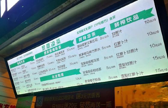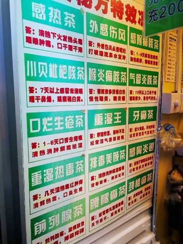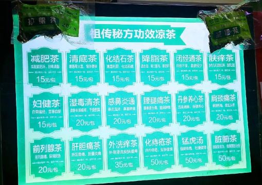 这家凉茶店店面不大,主打各种凉茶。那天正好经过,感到嗓子不舒服,买了夏枯草罗汉果五花茶和毛根马蹄竹蔗水,都是煲好后一大罐配送过来的。店员分装成小瓶给我,并且很耐心告诉我这两种凉茶的作用。 他家的凉茶品种很多,分为治病的和保健的两种,价格不贵。