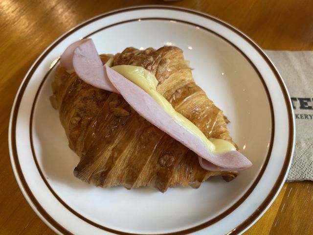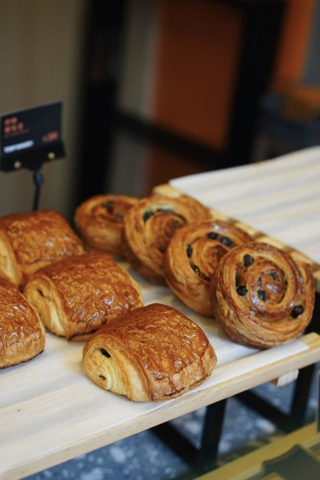 陌染MM秒杀了这一家面包店的一份餐食,它位于市桥光明北路,地铁三号线市桥站C出口出来向前走,过了红绿灯的光明北路公交车站那里就是了,门口不大,需要留意一下。网上看了评论大家都说不错,好奇我也来试一下,店不大,一楼就两张小桌子,有二楼,这里的服务还不错,出品也挺快的。 {芝士火腿丹麦},就是一个牛角包,中间夹了一片芝士片和两片火腿肉,火腿肉没有煎过,是白肉,芝士片有点奇怪,吃起来口感是酸酸的,不喜欢酸的口感,还是原味的好,奶味会重些。当时这款牛角包还没有出炉,需要等上几分钟,所以我吃的时候面包是刚出炉不久,热热的,香香脆脆,很酥。 {澳白},这款咖啡应该是比拿铁咖啡的咖啡浓度要浓一些,但是我喝起来咖啡味只是一般般,而且杯子很小,份量也就不多了。