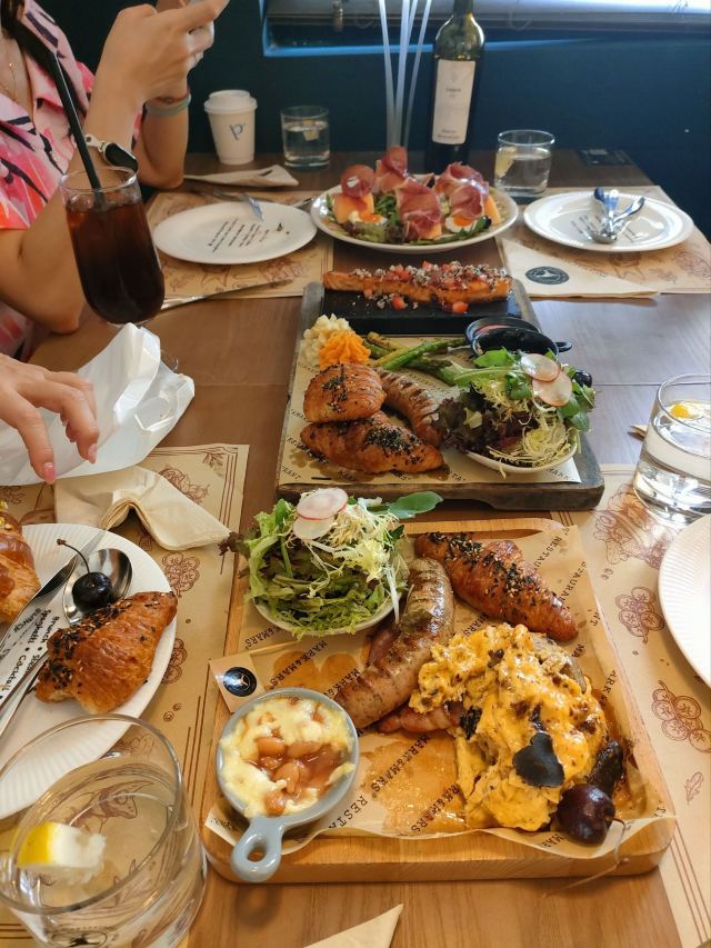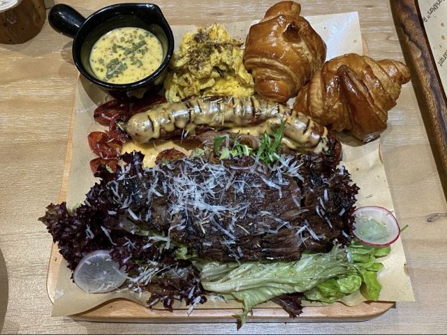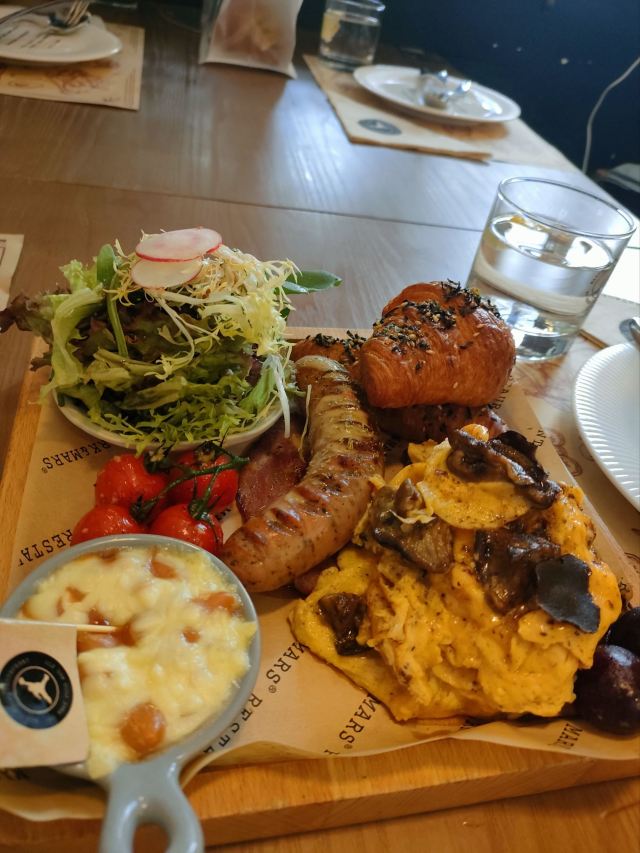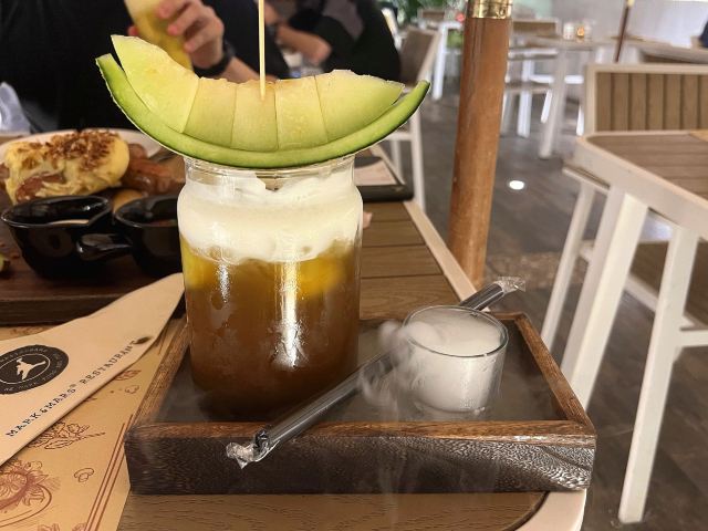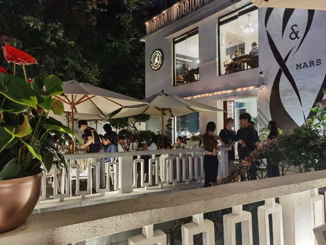 Kami Kwong「Mark&Mars」在广州有着颇高的知名度,位于环市东路店的这家是自带花园的白色独栋洋房,装修简约,原木色餐桌、艺术壁画、美式炉灶等物品为空间增添了不少韵味,落地大玻璃更能让客人在享受美食之余欣赏到外面的美景,用餐环境舒适惬意。用餐区分独栋洋房的上下两层,以及洋房外的露天阳台,如果想在玻璃房用餐,周末务必提早订位,另外人多出餐稍慢。 出品方面,主厨甑选熟食拼盘,里面有牛羊排、熟三文鱼、香肠、土豆泥、薯条和一些配菜等,份量还是挺足的,牛排虽然软嫩,但牛肉味不突出,羊排不膻,但脂肪占比较多,三文鱼肉质细嫩紧实,香肠很扎实;菠萝的海,清新香甜的味道扑鼻而来,还不错;静冈蜜瓜乌龙桂花茶,这块静冈蜜瓜一点都不甜,也没有细腻绵密的口感,跟静冈蜜瓜没啥关系,乌龙桂花茶倒是挺香的。 总体环境是不错,很有氛围,打卡拍照一流,出品还可以但不及预期,夏天户外餐区建议增加驱蚊虫的设备