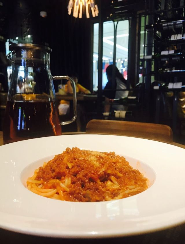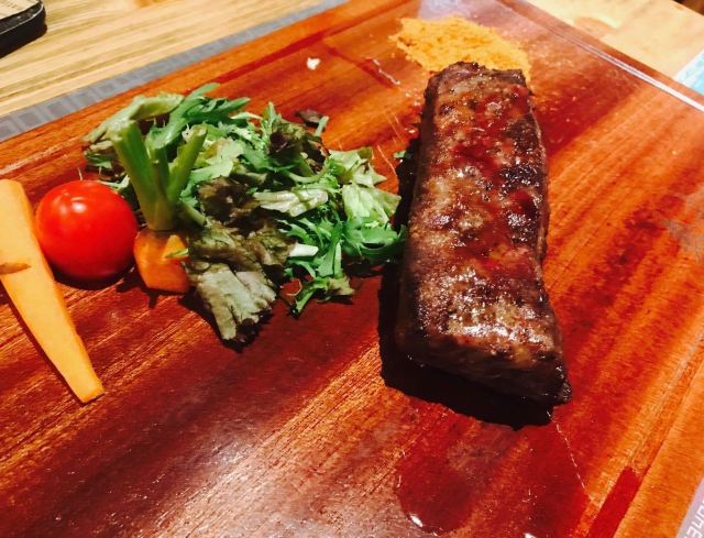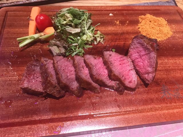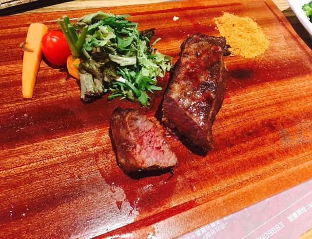 下班后和同事吃饭,来音乐餐吧放松心情。进去感觉很热闹,有歌手在唱歌,台下坐满人,气氛很好。 牛板腱七成熟,木板上,切开后可以清楚看到里面半红的肉,带一点血丝,吃起来还不错,肉够嫩。 番茄肉酱意粉,肉末十分多,配搭软软的意粉,好好吃,酱料不会太酸。 肉吃多了来一份素菜,蒜蓉炒西兰花,美味可口。