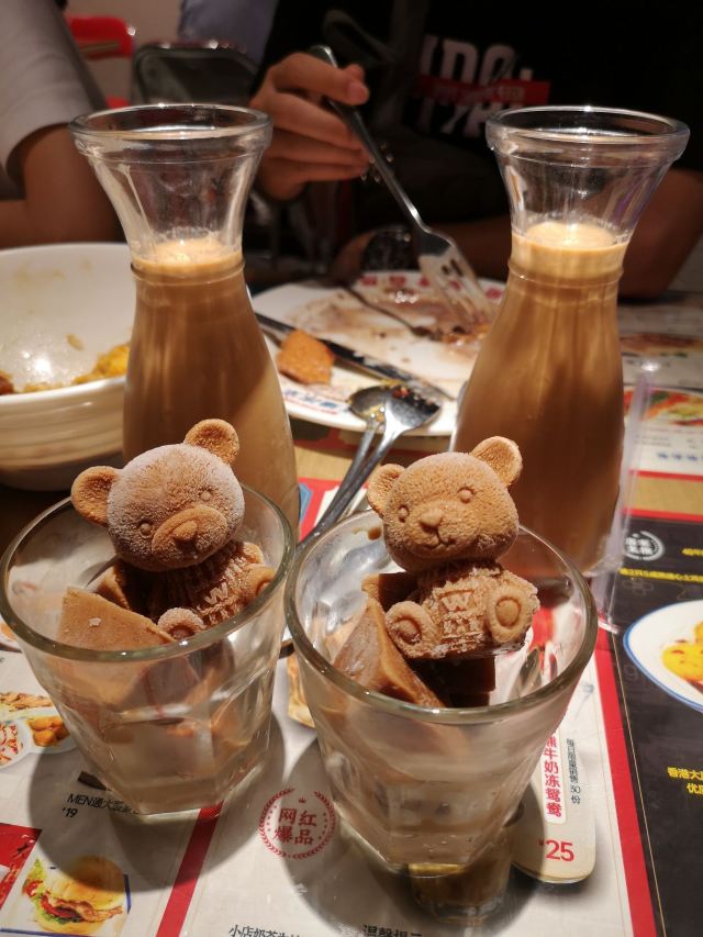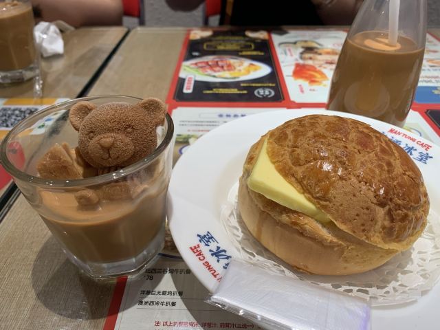 江南西地铁出来富力海珠城A区负二层,位置很好找,由于周六早早过来还是要等位,餐厅环境以港式茶餐厅布置,感觉有点拥挤,店内位置有限。网红熊仔奶茶,爆浆西多士,味道中规中矩,分量很足,人均消费60左右。。