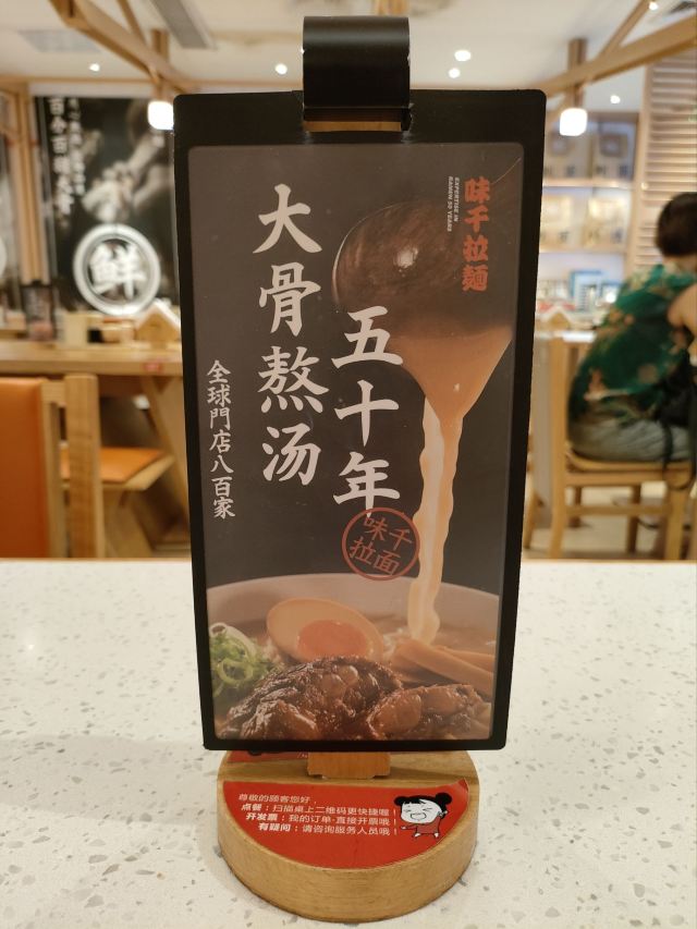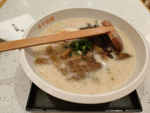 最爱味千拉面的浓汤,最爱味千拉面的大骨软骨浓汤拉面,面很有弹性,白白的汤让人吃了还想吃,软骨很烂,特别适合我这种牙口不太好的人。天娱店就在岗顶地铁上盖的天娱广场三楼,环境不错。