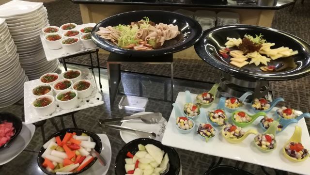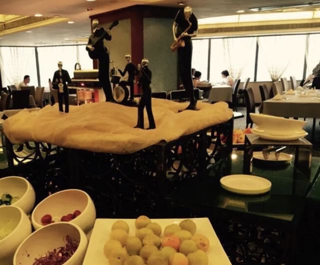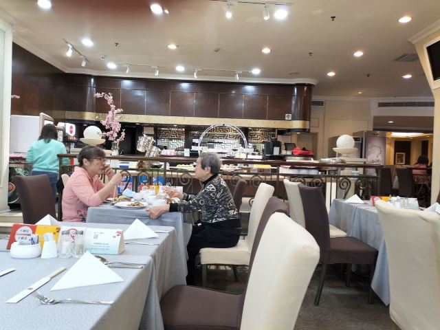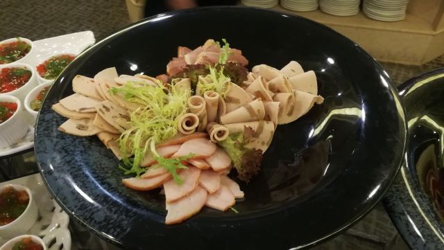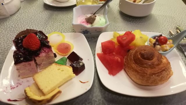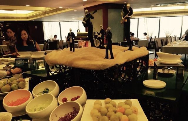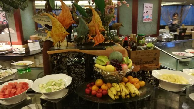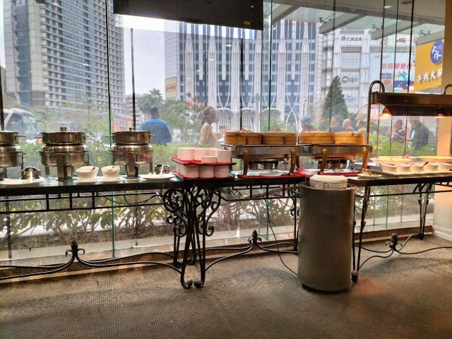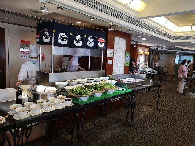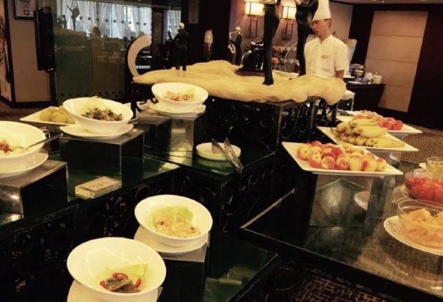 陌染MM这里是一家老牌四星级酒店里面的自助餐厅,其实我作为一位老广,还是头一次来到这里吃饭,这家酒店位于河南,在昌岗地铁站出来就是了,交通很便利,餐厅在酒店的五楼,最近他们的午餐有名店抢购,很便宜,79元一份,所以我也来凑凑热闹了。综合来说,没有贵价的东西,只有三文鱼刺身算是好一些了,没有限量,师傅一早已经切好了一份一份的,一份大概是四件,又或者你可以叫他一次性给你多一些,不多,我觉得那个人是不会切三文鱼的,因为吃起来是有筋的,要吐出来,我还是头一次吃到有筋的三文鱼,哈哈。餐厅里面吃饭的客人真是不多,只有几桌子而已,食物的品种也不是很多,有些东西是出完了一轮就没有了。但是以79元的价格来说,可以吃得饱,也对得起价格吧。 使用团购的,每人会送一盅炖汤,有两种口味的,清润的雪梨汤或者是一种草药汤,感觉冷盘的东西还可以,例如凉拌支竹、凉拌鱼皮,还有青瓜等等,都是我喜欢吃的。水果嘛,很多是没有味道的,西瓜也没有味道。冰冻海鲜就只有虾、花甲和另外一样东西,忘记了。甜品区域还不错,蛋糕有好几个款式,有抹茶味的、芝士味的、草莓味的等等,另外还有炖蛋、布丁的,甜品还算是过得去。 服务还可以,由于客人也不是很多,所以他们收拾盘子挺快的,你一走开去拿东西吃,他们就会过来收拾盘子。