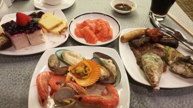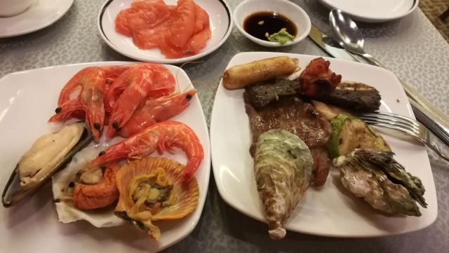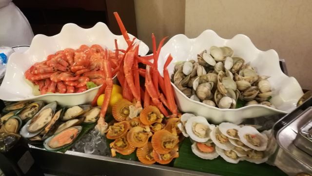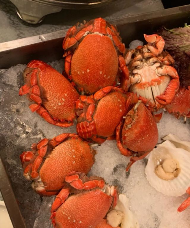 三文鱼,元贝,意大利芝士蛋糕,咖啡,面包布丁,雪糕,鸭胸,黑椒牛仔骨扒,冰镇蟹,沙拉,牛扒,鸡扒