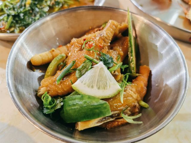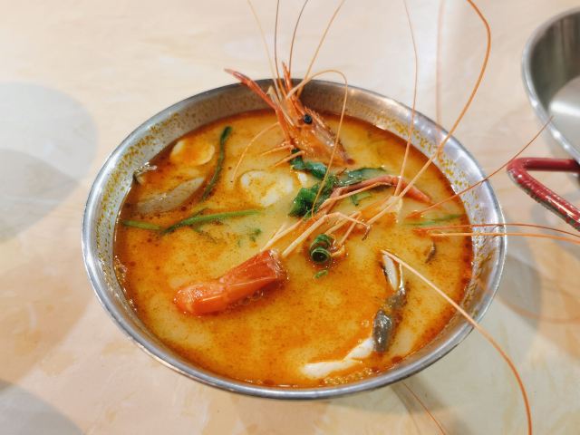 在某短视频平台看到推广很火🔥爆的一家清迈大排档,收藏了一段时间,春节期间想来的,但不营业,终于找到机会过来试。 [薄荷]环境: 门口停车住不多,5点多6点没到,基本车位已满...在市桥,介绍只此一间无分店。很清迈的风格,门面很大,到6点过后基本已经要开始等位了。 |泰仔冬荫功汤^很正宗的冬荫功汤,好喝,喜欢喝的直接每人一碗,我俩想着偿试,点了一份,不够喝😂😋。 |泰仔通菜^就喜欢吃泰式炒通菜,但味道偏淡了点,还能接受再浓一点。 |柠檬草鸡脚^鸡爪真的好吃,一人吃完一份还想再加,酸酸的很开胃。 咖喱海鲜的话不过不失,就是泰国大排档的味道,没有某...叶泰国餐厅做出来那种咖喱的高级感。不过一分价钱一分货,就近想换口味的话还是值得来打个卡[呲牙]