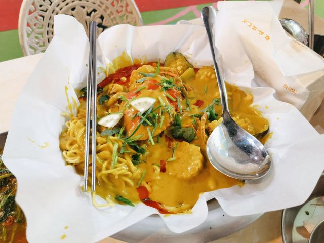 vv-oo在某短视频平台看到推广很火🔥爆的一家清迈大排档,收藏了一段时间,春节期间想来的,但不营业,终于找到机会过来试。 [薄荷]环境: 门口停车住不多,5点多6点没到,基本车位已满...在市桥,介绍只此一间无分店。很清迈的风格,门面很大,到6点过后基本已经要开始等位了。 |泰仔冬荫功汤^很正宗的冬荫功汤,好喝,喜欢喝的直接每人一碗,我俩想着偿试,点了一份,不够喝😂😋。 |泰仔通菜^就喜欢吃泰式炒通菜,但味道偏淡了点,还能接受再浓一点。 |柠檬草鸡脚^鸡爪真的好吃,一人吃完一份还想再加,酸酸的很开胃。 咖喱海鲜的话不过不失,就是泰国大排档的味道,没有某...叶泰国餐厅做出来那种咖喱的高级感。不过一分价钱一分货,就近想换口味的话还是值得来打个卡[呲牙]