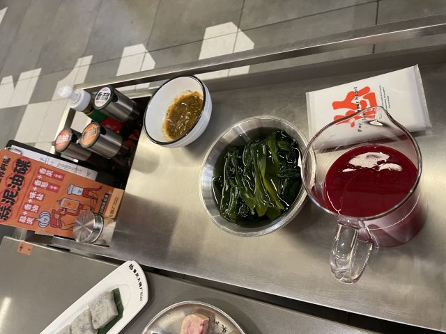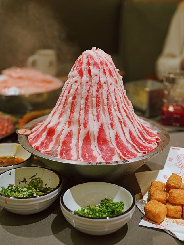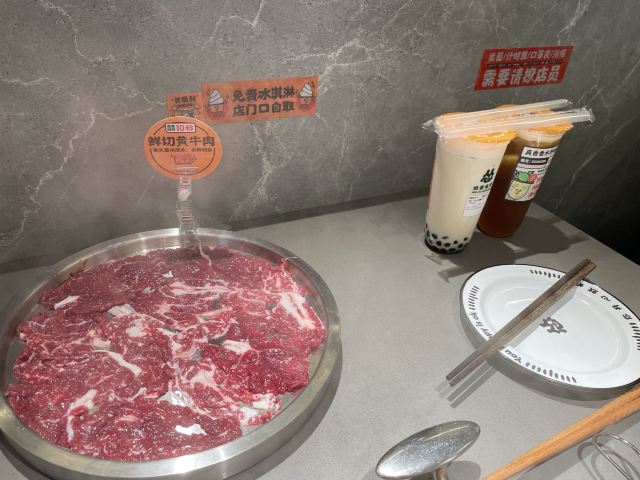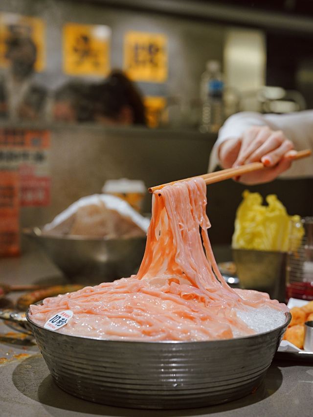 本来前几天想过来吃,结果5点多拿号等到8点都没得吃就放弃了[捂脸]这次早早过来不用排队真好[呲牙] 九毛九开的这家新潮火锅店感觉真不错,服务员超热情,还有空没空过来秀段街舞,感觉不会跳舞都不好意思过来上班了~ 店内环境不错,挺光亮干净的~ 这里的锅底只有一种——牛油辣搭果蔬锅,很适合选择困难症的~ 「鲜切黄牛肉」这个不愧是招牌,煮一煮配上特制的酱料,好吃的不得了,秒杀那些潮汕火锅~ 「纯手打的越南青虾滑」放在辣锅煮一下,吃起来很爽口~ 「鲜鲜鲜鲜鸭血」作为一个不吃鸭血的人,看到这么特别的新鲜鸭血,忍不住试了一下,嫩嫩滑滑的好好吃,推荐~ 「美国雪花肥牛」大大一盘堆成火山似的肥牛,肉质不错很有口感~ 「屠场生抠鲜鸭肠」吃火锅怎么能少了鸭肠呢,灵魂般的存在~ 「智利黑猪五花肉」摆碟不错,很好吃~ 「午餐肉」实实在在的午餐肉,加点辣椒粉感觉像吃烧烤~ 「香卤耙耙大鸡爪」这个鸡爪极力推荐,放在辣锅里煮两分钟,辣辣的超级好吃,最适合鸡爪控了~ 「霞浦超鲜海带苗」这个海带看起来挺新鲜的,味道也不错~ 「蛋煎糯糍粑」很香口,感觉不沾酱更好吃~ 「真香香水柠檬茶」吃火锅的标配,很解腻~ 「珍珠奶茶」很好喝,珠子也很弹牙~ 「酸梅茶」这个采取自由斟方式,酸酸的也很解腻~ 「雪糕」吃完火锅后,再来个自由斟的雪糕,好舒服~ 值得一提的是这里点饭居然还有半碗点的,真的只是装碗的一半喔,很适合小朋友和饭量小的,不用再为分饭麻烦了,好体贴~ 另外洗手间还提供漱口水,衣物清新剂,香香的出门真不错~