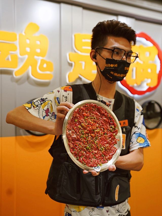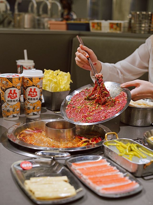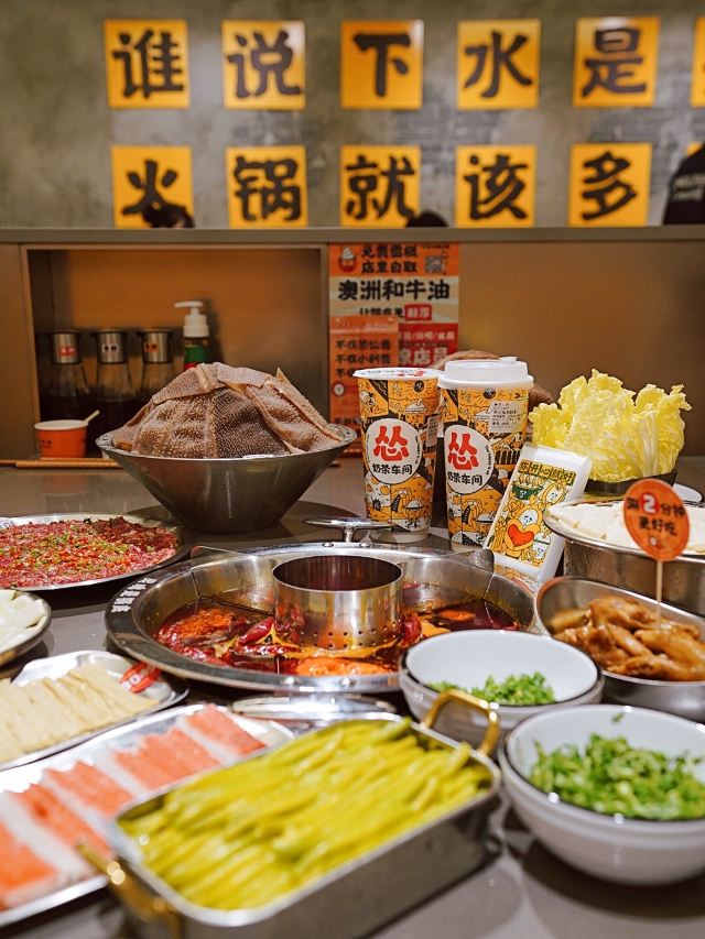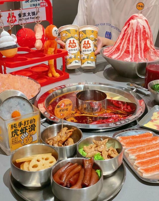 加油干饭呀吃火锅,从心,认怂❣️工业废墟风装修,嘻哈音乐超有feel,让你身体也跟着不由自主摇摆,自带bgm的重庆火锅厂,细节感满分💯 🌶️牛油辣搭果蔬汤🍲 可可爱爱的吃豆人造型,1/4果蔬骨汤清甜不失鲜美,自家工厂熬制的和牛油➕自家工厂炒的底料,久煮不咸,辣不伤胃。 ***造型的💣魔鬼辣弹💣,涮入锅中还会有“嘭”一声的音效,超级带感🎶 谁说下水是头牌?火锅就该多吃肉!堆积成山的🇺🇸美国雪花肥牛🥓也太太太牛了,肥牛界的珠穆朗玛峰非Ta莫属⛰️ 怂奶茶车间,奶茶精的快乐星球,奇兰大红袍拼配茶叶➕鲜奶=🧋开心加料奶茶🧋,绝对让你加料加到爽✅ 烧仙草,豆花,椰香麻薯,芝士奶盖,小珍珠,脆啵啵,碧根果,奥利奥,可以免费任选3种🆓 推荐搭配💁🏻♀️脆啵啵➕麻薯➕碧根果 店员小哥哥不仅颜值超高,还各个都是撩妹高手,你以为只会say hello❓还舞技爆棚‼️快闪舞show time也太燃了吧🎇晚市6点和8点各有一场,史上与男团最近距离的接触💃🕺get沉浸式火锅体验✔️
