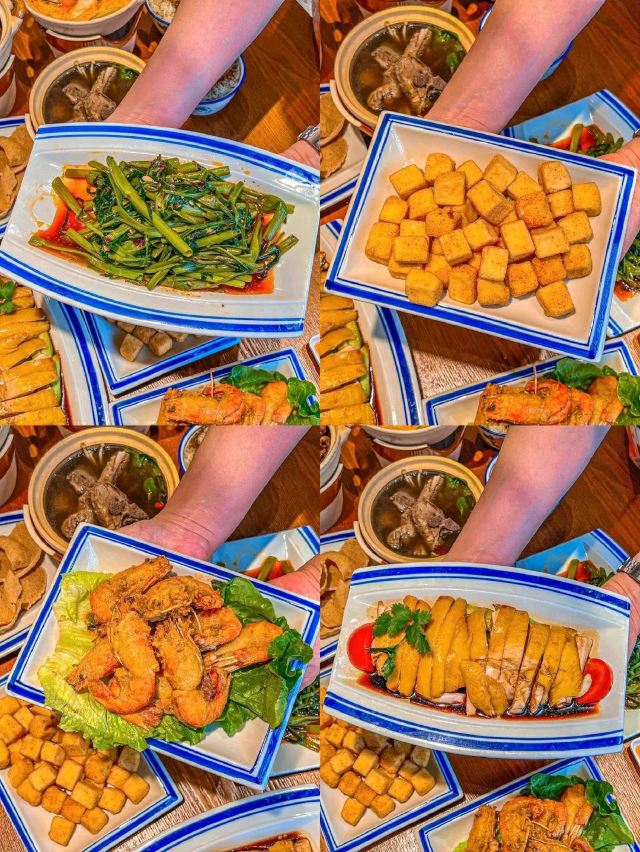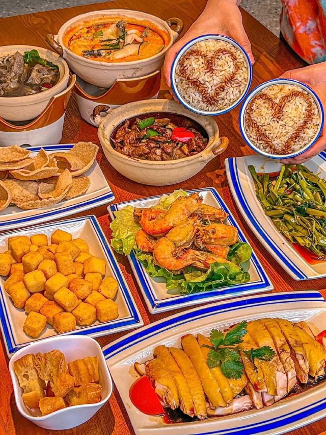 招牌海南鸡(半只),鸡油饭,香脆豆腐,誉约肉骨茶(小份),马拉盏通菜,马来咖喱滑蛋牛肉,青檬薏米水,马拉盏炒花甲,冬阴功无骨鱼,誉约海南鸡套餐