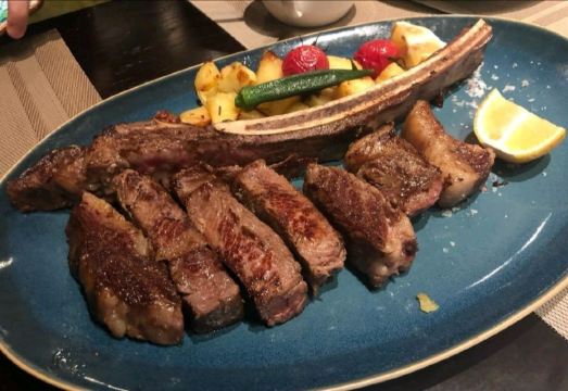 战斧牛排时间要等很久。肉质很肥腻。好多好多肥肉。不推荐。催了两次单才上。摆盘的土豆蔬菜全是冷的。影响口感。黑松露炖饭很香。就是黑松露有点少。火腿哈密瓜,摆盘有些粗糙。没有卷起来,火腿口感整个很软烂。不好吃。三文鱼骨依旧这个味道。披萨饼边烤的很好吃。超香