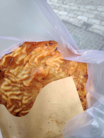 灯盏糕,听说过很久了,一直以为是蒸糕类的。这次到温州终于一见真容,原来是油炸食品啊。初见以为是空心的油炸面粉泡,细看又觉得象上海的油墩子,上手觉得怎么那么沉。入口才知内容丰富:外壳香脆,内有萝卜丝,还有肉馅儿,最中间是个鸡蛋!我只想说,一个就能吃撑了。