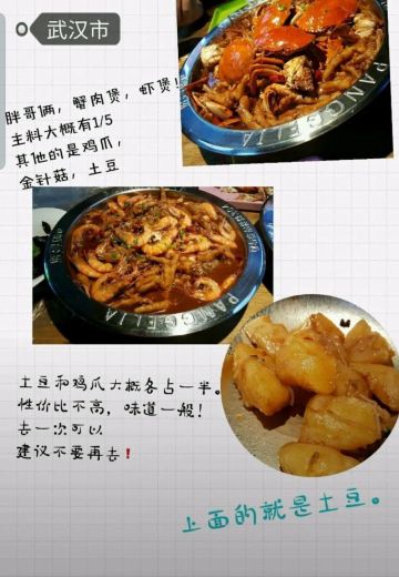 Panggeliarouxiebao (chengshiguangchang)环境和服务都不错。我们是广发银行做的活,一盘蟹肉堡。一盘基围虾,下底的东西非常多。主料只占食材1/5。其它配料为:土豆,鸡爪金针菇。味道一般。加上配料分量很足。