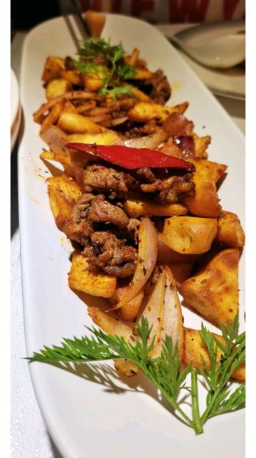 从地铁6号线鞍山西道站出来就是阿依莱新疆餐厅,超级近的距离,周边就这一家餐厅~也不知道修地铁时是怎么挺过来的,哈哈~朋友小聚选择这家餐厅,地点适中,环境不错的,朋友喜欢吃鸡肉,来一份大盘鸡,鸡块入味不柴,几根宽面条作为主食也可以填饱肚子的,土豆非常烂乎~一杯酸奶加上上面点缀的坚果营养又健康~大拌菜中规中矩~烤馕香脆可口,有羊肉串的味道,哈哈哈~整体都不错的,附近的居民有福气啦~这里适合家庭及朋友聚餐~
