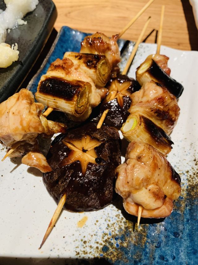 在日本料理店,除了非常喜欢吃三文鱼和寿司之外,然后嗯还比较喜欢吃各种煎串烤串,特别喜欢吃香菇串浓郁的香菇味道,简直太好吃了。