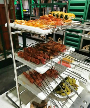 秘制烧烤串,特色牛筋皮,鲜羊肉串,石锅拌饭,蜜汁鸡翅,烤面包,现串羊肉大串,掌中宝,牛肉串,朝鲜冷面,现压冷面,阿根廷大红虾,蜜汁烧烤穿,啤酒