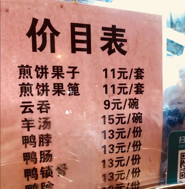 煎饼果子,煎饼果篦,鸭脖,鸭锁骨,鸭胗,云吞,鱼豆腐,双鸡蛋果蓖儿,南楼煎饼,双鸡蛋单果子,高汤馄饨,羊汤,油条,冰镇手工花生露,鸭板肠,豆浆,酸梅汤
