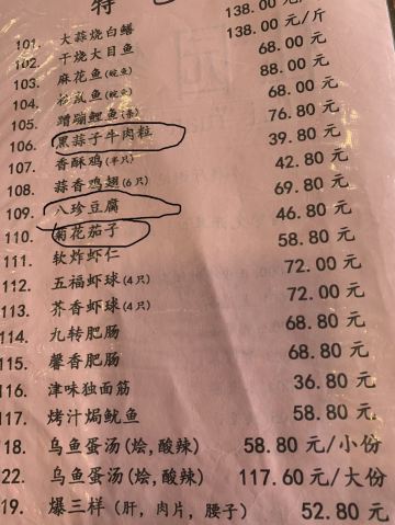 八珍豆腐,芥末黄瓜墩,软炸虾仁,菊花茄子,九转肥肠,黑蒜子牛肉粒,椒麻鸡,罾蹦鲤鱼,鱼香肉丝,海鲜豆腐羹,香酥鸡,蛋黄焗南瓜,炒鳝鱼丝,松鼠鱼,清蒸鲈鱼,香辣牛蛙,糖醋鱼片,蟹黄豆花排,新加坡牛柳,番茄鱼片,黑蒜子牛肉,独面筋,爆三样