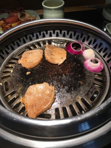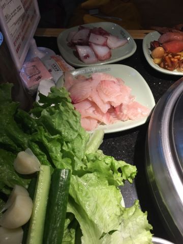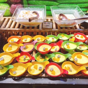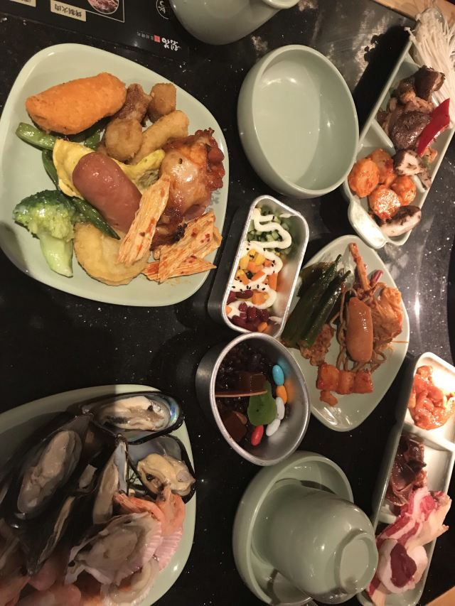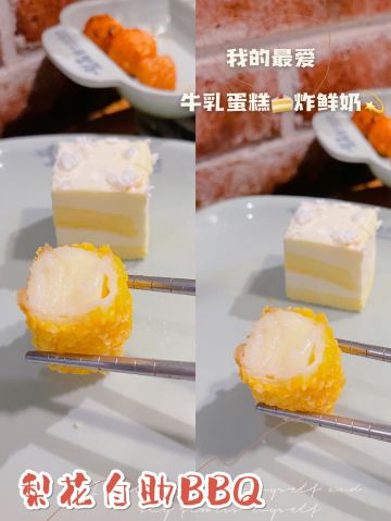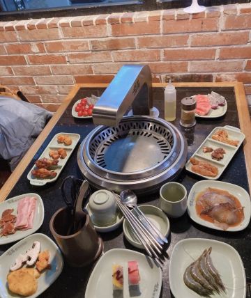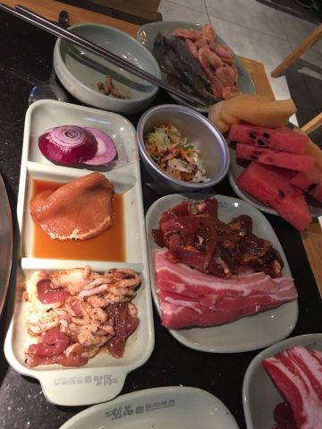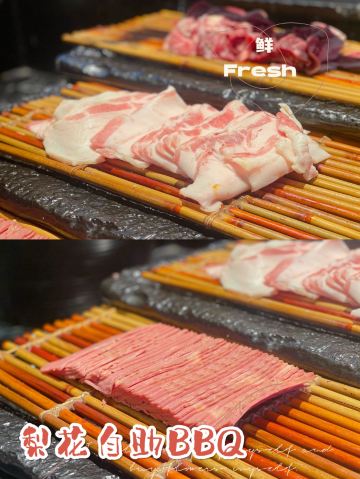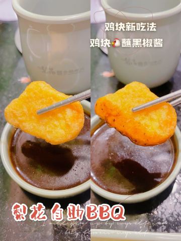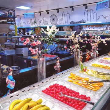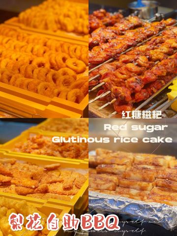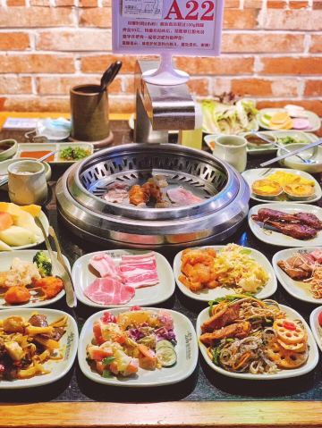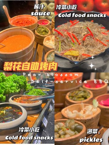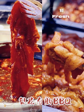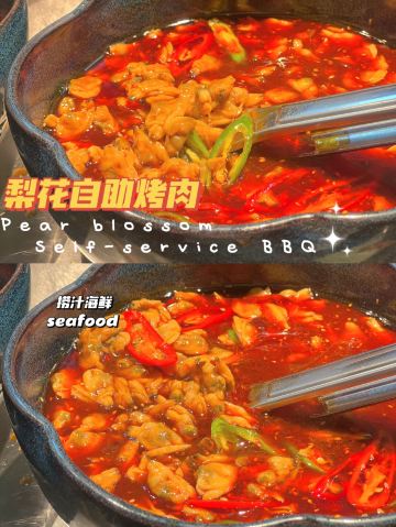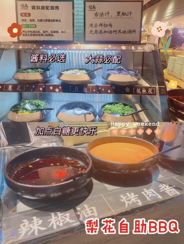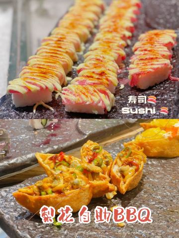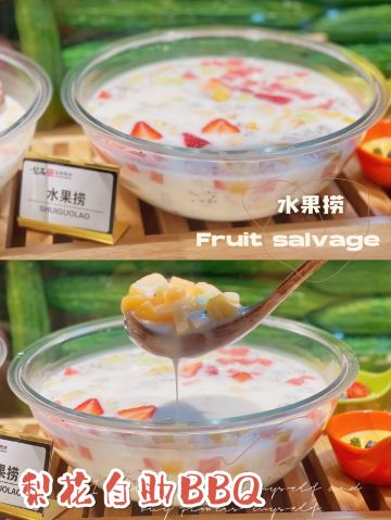 可航min1-芝士焗红薯🍠,这个很可爱哎,其实也没有在边边角角,只是在里面一排,一定要试一试~热热糯糯的,在披萨后边,用大勺挖它一下~ 2-红糖糍粑,这个比较新颖吧,一般川菜和火锅比较多点红糖糍粑吧,没想到烤肉店也有吧~ 3-辣子鸡!🌶️,这个看着很像普通熟食热菜,但是它真的很好吃,鸡肉块并不辣,炸的很外酥里嫩,一点也不干,特别推荐大家尝尝,打破大家对自助餐熟食的壁垒! 4-炸鸡块-自创了一种新吃法,取一碗黑椒酱,蘸着吃 🌠生鲜海鲜自助区🌠 鲜虾🦐和北极甜虾必不可少 鲜虾太可爱了,青涩的皮肤~我真的很爱吃这种鲜虾,烤一烤不沾酱料就很好吃,因为新鲜嘛~个头不算小的,我一口气可以吃掉一整盘~ 北极甜虾,也是我的最爱,海鲜界,在我眼里北极甜虾拍top1,因为那个满满的籽真的很好吃,稍微烤一烤就可以了,甜虾的肉也是甜甜的,也是不需要沾酱料~ 1-个人最喜欢机打的柠檬🍋红茶☕️,凉凉的,也解烤炉的热燥气,又不会太冷伤到肠胃~ 2-三个特调饮品-台农芒果-岭南荔枝-红芭乐,这三个是特调冰镇的,推荐给喜欢冰冻🥶口感的大小伙子们 3-米酒-这个是机制的,度数不会很高,但是比较浓稠一些,适合喜欢甜味的朋友 4-百威啤酒,基础款,方便拿取,启瓶器在它旁边 5-宏宝莱的花生露🥜,在百威旁边,找不到就问一下服务生,服务生动作都很快,很好说话的。这个也是我个人比较喜欢的,也推荐给小孩子们喝~ 🌠生鲜调味肉自助区🌠 1-比脸大的牛排🥩,它真的很大,品质很高,完全不输某些专门烤肉日料韩料店,因为肉很新鲜,很大块,很实在,烤起来又很好吃~一定要拿一块,两三个人一起吃! 2-黑椒鸡柳,这个别错过啦,我发现他家最拿分的还是腌肉,很适合我的口味很好吃哎,尤其我还喜欢黑椒~对上了我的心思 3-蒜香龙利鱼,他家对食材腌制的把控力还是很好的,比如规避了所有的肉都是一种腌肉料一种口味的口味大忌,给了客户丰富的体验感 4-土豆片,厚切土豆片可能没有几个girl不爱吧 5-辣白菜五花肉,五花肉看个人口味,有一种调味的,一种非调味的可供选择。大人还是适合辣白菜的,辣白菜和五花肉是真的很搭对~ 1-极力推荐生菜🥬+蒜片+每桌上都有的干蘸料+椒圈,简单配烤肉 2-湿料,辣椒油+白糖+麻酱,配未腌制过的烤蔬菜和烤鲜肉 水果还是很新鲜的,因为每天都会卖光上新啊 爱吃什么就自己拿吧