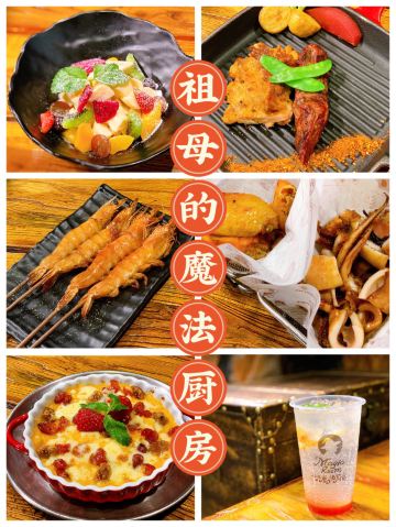 闹闹没溜爱耍宝祖母的魔法厨房陆家嘴店 📍详细位置:大丰路陆家嘴购物中心5层 ⏰营业时间:11:00-14:00 17:00-21:00 🅿️停车攻略:商场提供最高4⃣️小时免费停车(会员专享、消费满额、积分兑换) 🚉交通信息:地铁1⃣️号线-西北角站(A口) ❗️推荐特色:碳烤明虾、魔法红薯恋果果、祖母魔法大鱿鱼、双拼肉排 在美食云集的陆家嘴购物中心,有一家风靡全国的魔幻主题西餐厅,这就是“网红”祖母的魔法厨房。 走近门店,只见门前祖母婆婆造型的摆件,好似引领你走进充满神秘的魔法世界。店内的装饰设计呈现复古与现代的融合,柔和的灯光带来浪漫与温情,盎然的绿植、墙壁的涂鸦、诙谐的玩偶......有种置身于童话王国的既视感。 「魔法红薯恋果果」 犹如奶浆果版的芝士焗红薯泥,奶香的芝士层包裹有软糯的红薯泥,表层点缀有草莓、无花果和蔓越莓等果肉颗粒,只不过整体的甜腻度过重。 「碳烤明虾」 烤虾采用4只起售的形式,每只都个大饱满,经过配料调味后有着咸鲜的味道,食用起来更是紧实嫩弹。 「祖母魔法大鱿鱼」 这里的大鱿鱼切分成若干小块,每块上都混有汁料带来的酱香味,咬上一口嫩滑中伴有韧弹的咀嚼感。 「热带果肉风情沙拉」 沙拉选取多种热带水果,包括草莓、香蕉、葡萄、火龙果和奇异果等,入口酸甜清新,再配上薄荷叶、芝士粉提升整体滋味。 「双拼肉排(牛+鸡)」 双拼选择了鸡肉和牛肉进行搭配,两者的质地厚实而口感相对平淡。其中,鸡肉入口软嫩,牛肉多了些许韧劲。