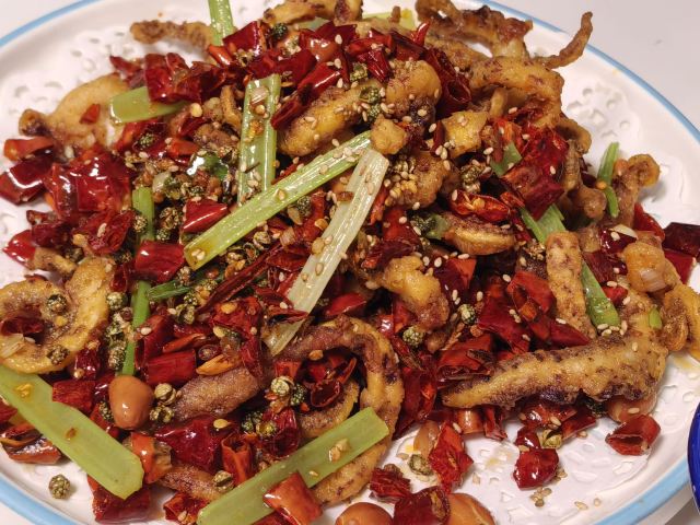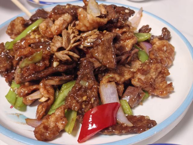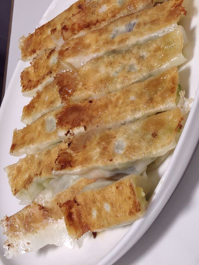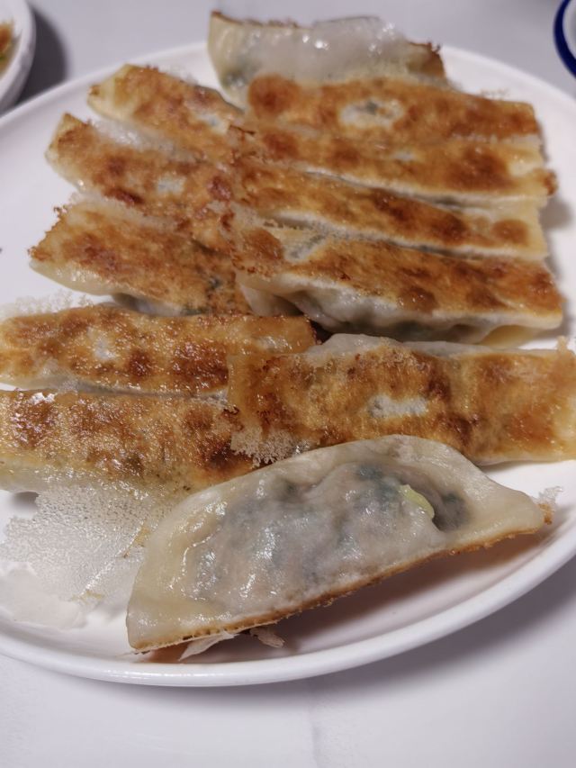 塘沽上海道边上的一家馆子,距离老码头不远,是一家开了有些年头的餐馆。餐馆分里外两处用餐散台,饭点儿,店里食客还是挺多的。他家经营的菜肴口味多样,津、鲁、川和海鲜,主食以锅贴饺子为主打。点了天津老爆三、辣炒鱿鱼丝和两种馅儿料的锅贴,锅贴儿按份儿,一份儿12个。菜量够大,口味够浓,锅贴儿中规中矩,口味咸度适中,素西葫芦馅儿内有虾仁儿,口味够鲜。总体感觉性价比还成。