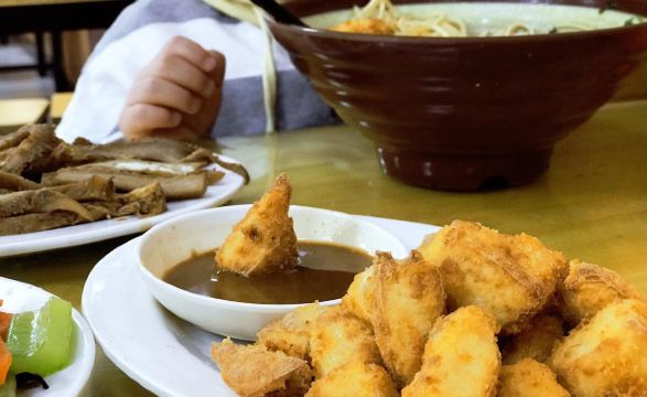 Honghuli Lamian Noodles在长辈们连续三天早餐吃“米记”后, 贪新鲜的我终于受不了了, 带娃直接打车来小舅妈推荐的拉面店, 因为她头一天说“好吃”了两遍, 不来对不起她的赶脚 炸豆腐必须点, 下单现炸上桌还烫手, 配着酱汁蘸着吃不要太香呀, 里边的豆腐嫩的像奶酪, 外皮酥到掉渣! 拉面汤绝对是牛骨熬的老汤了, 浓的都发粘, 味儿太足了 就是有点儿咸, 老汤嘛能理解, 然后我最后喝了两碗水, 还发现了墙上的奖牌 素什锦这个挺好, 配菜超多种类的, 清淡口儿搭配拉面正好。 牛肚有点儿咸, 讲真我算是挺重口的了。 再加上牛肚感觉放一段时间了, 口感虽然是不错, 但是新鲜度上差了点儿。 这我也很满意了, 换花样儿的心情总是很愉悦的。 下一站,戴记糖坊伴手礼, 走起……