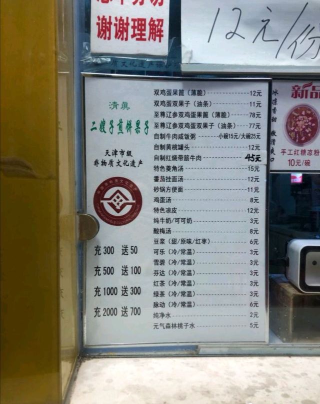 二嫂子煎饼馃子最贵的馃子,绿豆面的,配上薄脆或者油条,葱花,甜面酱,辣酱等等,就是正宗的煎饼果子,排长队,不还价,就是这么牛,没有办法,名气太大了。号称是继狗不理包子,十八街麻花,耳朵眼炸糕后的天津名小吃。好不容易买来一吃感觉一般,面皮太厚,油条太软还是两根,吃的太撑,味道没有小区门口买的好吃,价格还便宜一半,看来好奇害死猫呀。