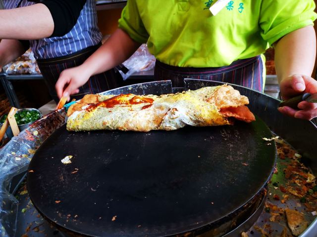 老槐树789为了尝一口煎饼果子,特意选了一家离二嫂子煎饼果子很近的酒店,一大早骑了辆共享单车,悠哉悠哉地找到了这个小门脸。说是门脸,其实就是开了个窗口,里面有三四个电饼铛,窗口外面有十来个人正在排队,两位大姐忙着摊煎饼。时间不长,热乎乎的煎饼到手了,立马骑车返回酒店,准备和家人共享。二嫂子煎饼名不虚传,比景点那儿的煎饼个大,佐料足,一个煎饼就吃的饱饱了。旅程结束了,有机会,还去吃二嫂子煎饼。