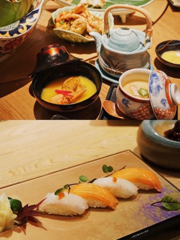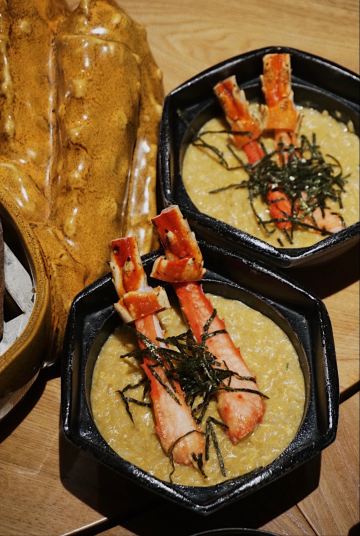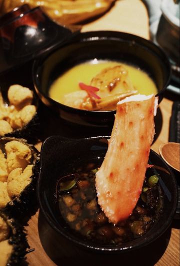 芝士焗帝王蟹腿,蟹黄泡饭料理,烤开边鱼,海胆煎饺,蟹肉加州卷,蟹脚茶碗蒸