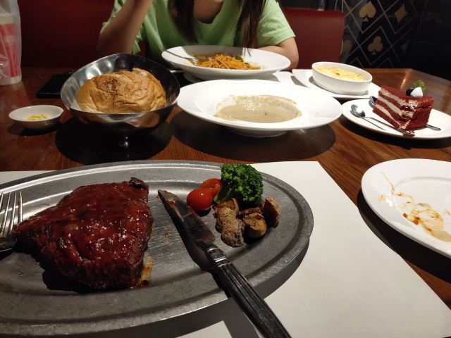 迪斯卡沃上次来还是装修之前,虽然这次装修之后变亮堂了,但是氛围没有了,我去的时候快晚上八点了,就像在食堂吃饭一样,特别吵,以后再去会提前预定包房,大厅的用餐感觉太差了。沙拉台除了水果没啥吃的,意大利面份量很足,够两个人吃的,小排皇的味道非常nice,这也是我愿意再次光顾的原因,和牛牛排,踩雷不推荐
