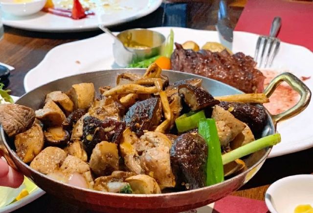 这是一家高端大气上档次,而且专做各种牛排的西餐馆。室内的灯光比较暗,很适合情侣约会。门面充满现代风,可是内里的撞色装饰却截然不同。惠灵顿牛排是好多人慕名而来的进店美食,外面的酥皮香甜酥脆,里面牛排多汁弹牙,口感不能再棒。