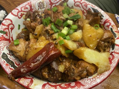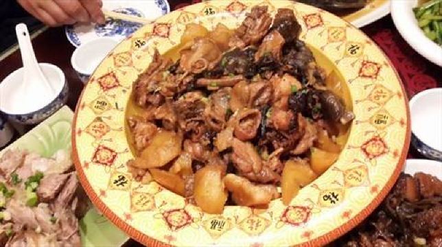 小鸡炖蘑菇,红烧肉炖干豆角,老式锅包肉,烀饼一锅出,雪绵豆沙,大拉皮,白肉血肠,酸菜烩碗,锅包肉,发糕,大铁锅炖豆腐,年猪烩菜,烤肉