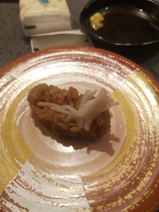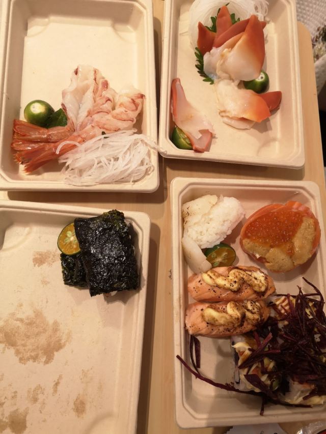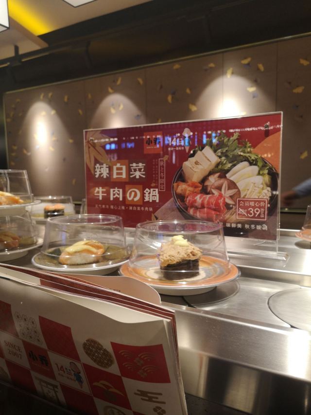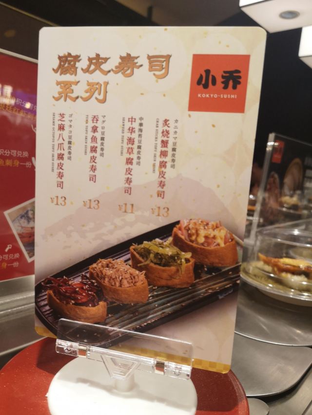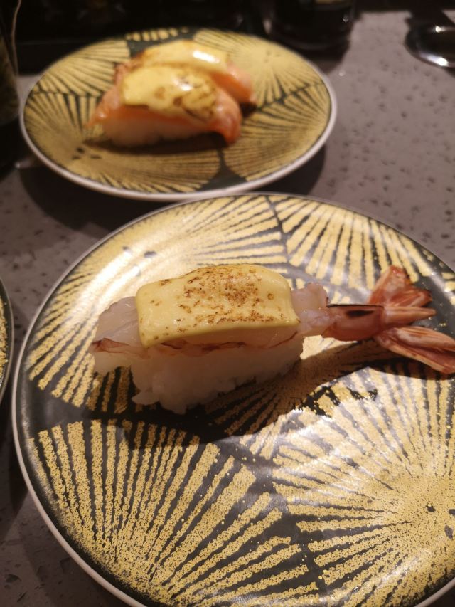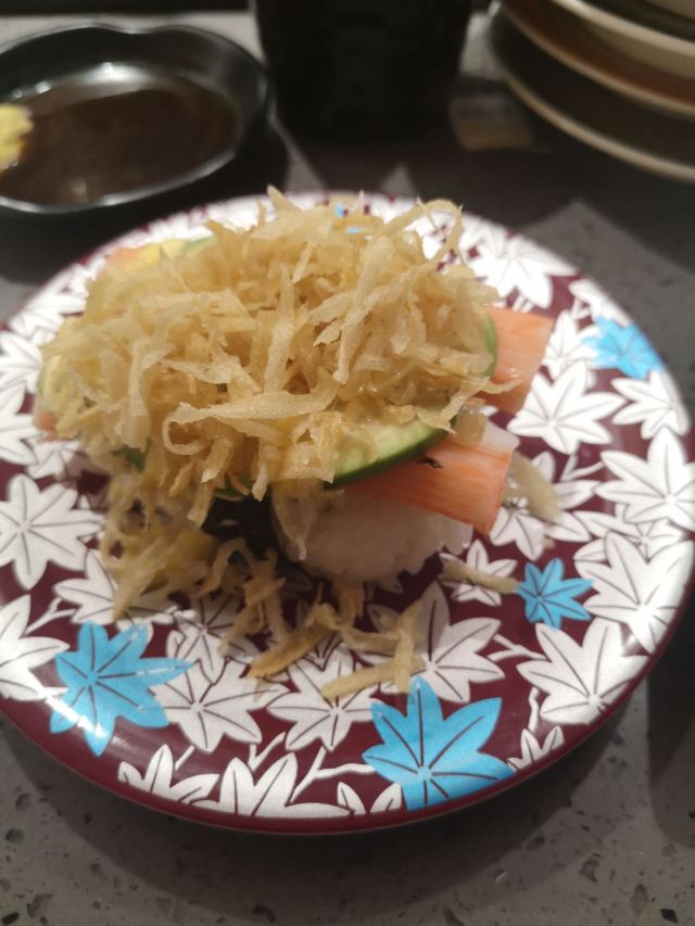 工作日晚上人也不算少,局促,好在一个人,所以轻松挤到一个位置。服务还算不错,蛮热情的,不过可能因为人多,点单上的并不算快。 传送带上东西挺多的,不过姜片太少了,而且需要补充,剩的都不太好了。新品这个腐皮蟹柳的来了一个还不错,现在不喜欢吃芝士的了,觉得味道占比太大,也融合不到一起去,底下的虾不错,鹅肝可能点的人少,做得太干了,酱汁味道也太清淡了没有清新水果味,牛油果蟹柳不错,帆立贝不错。 外卖的话,送来可能是太凉了,吃的我胃疼,海苔肥肝海苔太软了,虾吃三个就会腻了,一个正好的,普罗旺斯不错。