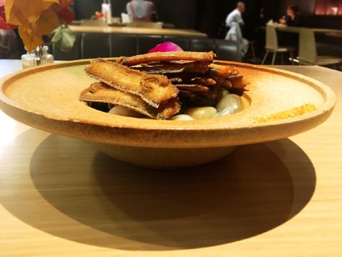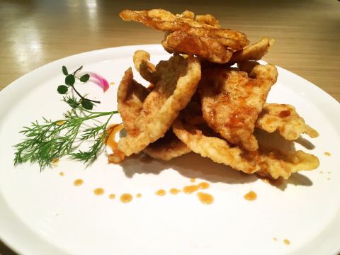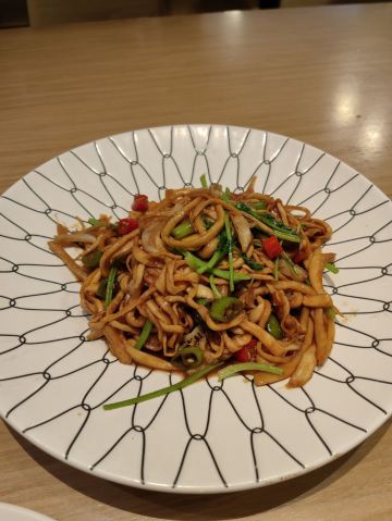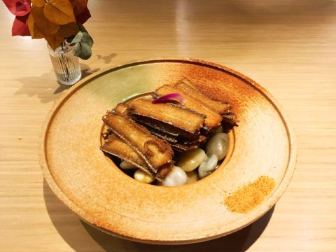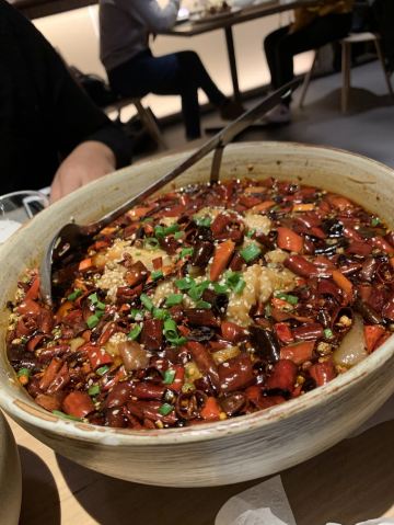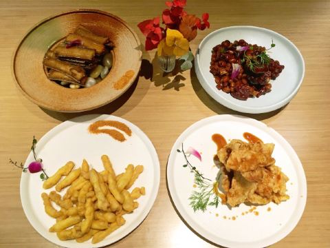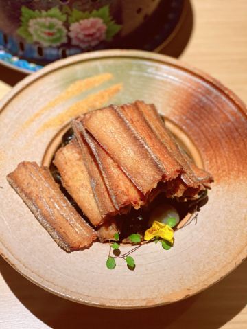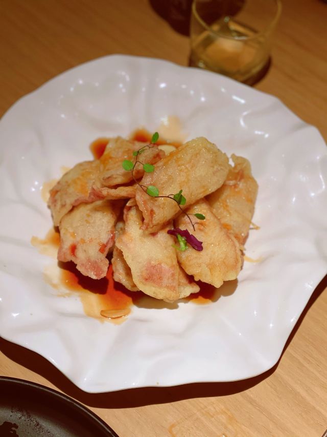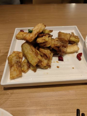 [环境]餐厅内的面积很大,头顶的造型很有创意,整体的装修颇有艺术气息。 [服务]特殊时期卫生工作做得很好,服务员们都带着口罩和手套,也会定期更换一次性手套,餐具都在消毒的基础上,再用热水烫。口罩也没有阻挡服务的热情又细心,温暖着我们。 「奉天老式锅包肉」老式锅包肉分为两种,一种是传统的猪肉,另一种是牛肉,牛肉的比猪肉的贵10元。 「炸刀鱼」视觉上显得刀鱼特别多,实际没有那么多喔,数量适中,也是很好吃。 「黑金猪手」黑金猪手的造型也很好看,猪手上覆盖的是花生酱,咸甜口味,猪手很有嚼劲儿,很好吃。 「软炸里脊」里脊的颜色看起来很有食欲,肉质很有嚼劲儿,很香。