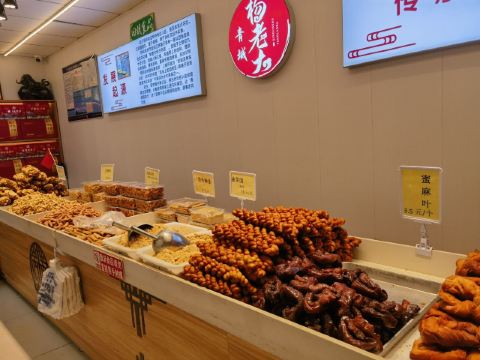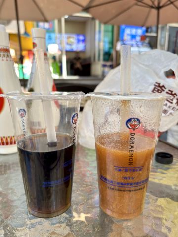 走遍天下XZ宽巷子和塞上老街,是呼和浩特市区两条最热闹繁华的美食街,一条在大召无量寺的旁边,一条在清真大寺的附近,吃的东西都很多,品种也大同小异,相对于塞上老街,宽巷子显得环境更宽敞舒适一些。 下午到清真大寺一看,要3点才开门,就先到宽巷来逛吃逛喝,店铺大多都在整理准备中,为晚上的繁华夜市备餐备料。 宽巷子有侧面和正中间两条街,以及旁边商业楼里的很多店铺,侧面的那条更凉爽一些。 点了一杯酸梅汤和一杯稀果羹,稀果羹是呼和浩特当地的特色风味小吃,一种酸酸甜甜、冰冰凉的饮料,里面东西很多,主要是一些当地所产的柿饼、杏干、枣干、山楂等果脯,再加上冰糖,打碎后制成的饮料,夏天非常解渴,也特别好喝,价格也就几元钱,不过含糖量很高,热量也足。