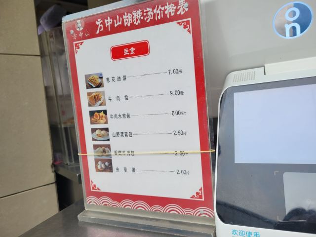 方中山胡辣汤,绿豆百合粥,牛肉胡辣汤,水煎包,素馅包子,葱花油饼,牛肉盒,香甜豆腐脑,油饼,酸奶,包子,素包子,黑米粥,5元胡辣汤,普通胡辣汤,肉盒,羊肉包,煎包儿,羊肉香菇包子,豆沫