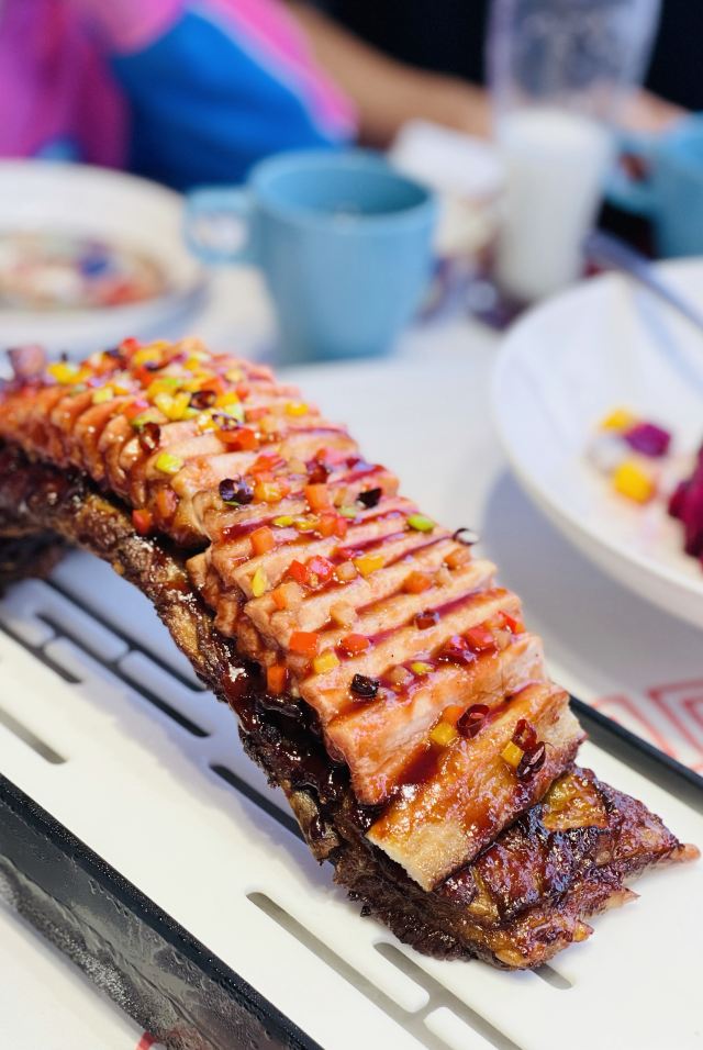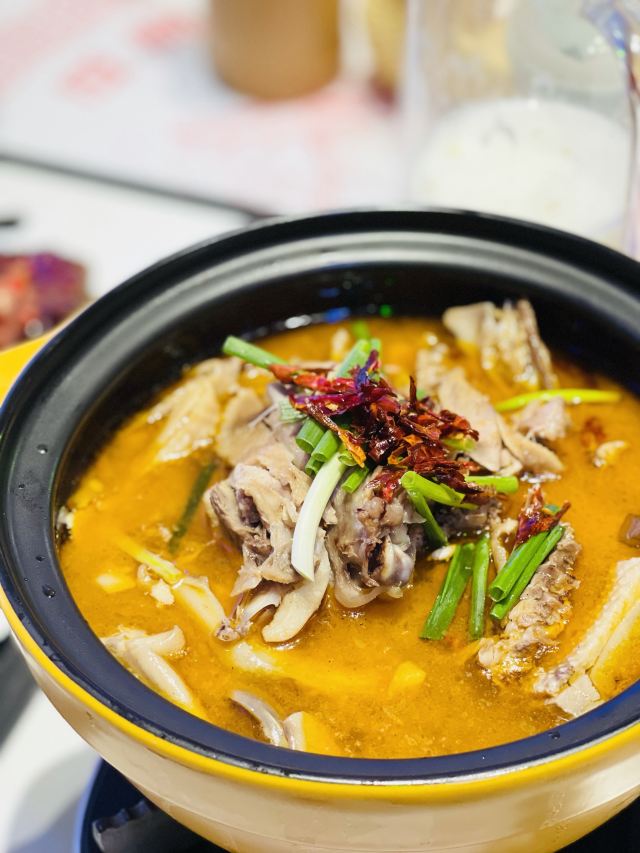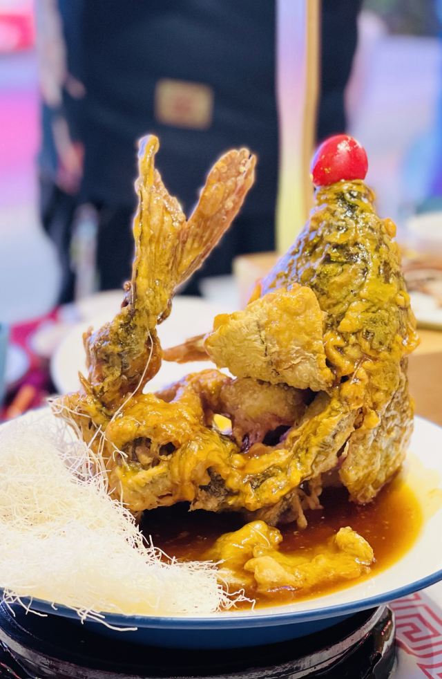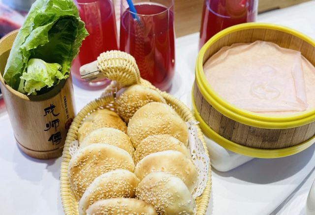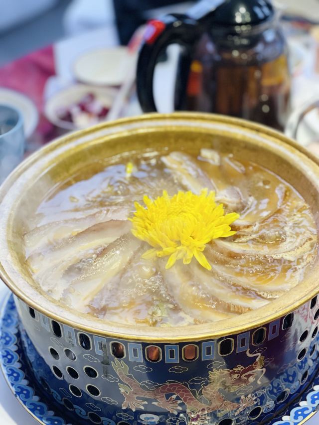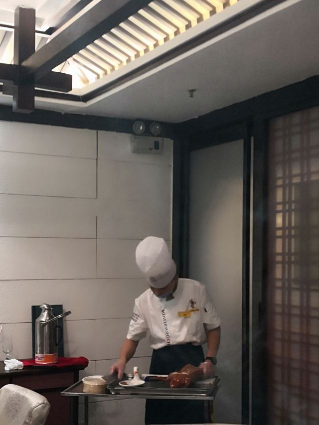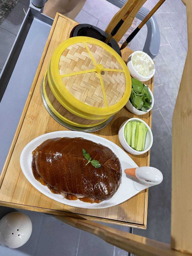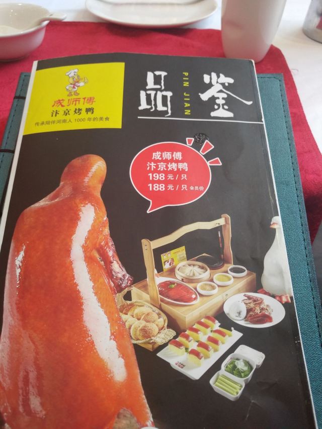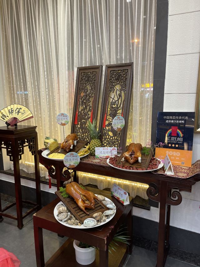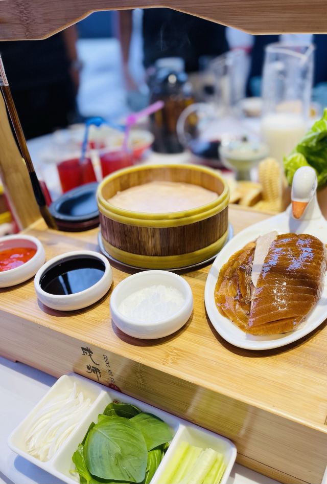 咪咕江郑州烤鸭届的“好学生”成师傅汴京烤鸭新品上市,最近就举了传统枣木经典烤鸭的“一”,变化出了鲍鱼烤鸭、红枣烤鸭、凤梨烤鸭的“三”。😃 甚至配烤鸭的饼,可制成高炉小芝麻烧饼、火龙果卷饼、或大罗马生菜🥬——这就非常贴合年轻人的口味了,尤其我家平时只吃肉的9岁狂热烤鸭爱好者。 制法大致是鸭皮果汁上浆,鸭膛放入鲍鱼、红枣、凤梨,再灌入熬制的果汁料汁,用枣木烤90分钟。其他依然是满满中国风,上桌的烤鸭盛器自带保温加热,鸭皮还是那么酥,可以蘸白糖直接吃~😚肉还是嫩,有汁水,毛笔蘸甜面酱刷饼,很有感觉。 这一次去成师傅,感觉烤鸭味型丰富的同时,还有菜品背后的文化解读更深刻了:北宋菊花锅、汴京虹桥排骨、黄袍加身、文豪固始鹅、金池汇七贤…服务员能讲每个菜品背后的故事。这一餐,既得药食同源之理,又听文人逸趣之雅,有梦回大宋的错觉。😁 话说,其实我觉得宋朝不是个好朝代,重文抑武,被迫南迁,凭借半壁江山飘摇百年。但是,宋朝的清风雅韵,文化蓬勃,荫及子孙万世。 更何况,1000年前的北宋汴京,发明了烤鸭~ 地址:正光路中兴路交叉口,成师傅汴京烤鸭,人均90元。