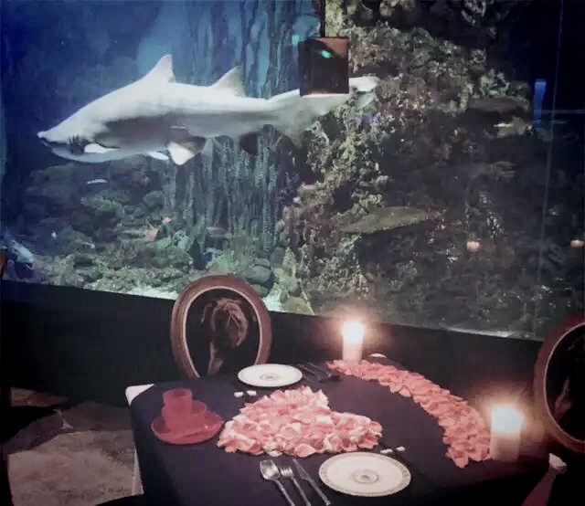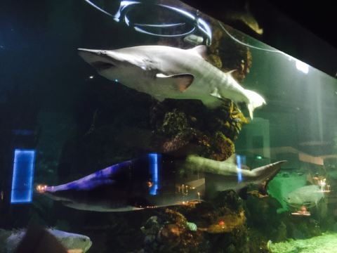真的有鲨鱼,而且不是一只,边吃边看鲨鱼游来游去,大嘴巴笑嘻嘻地,吃什么已经不重要了,哈哈