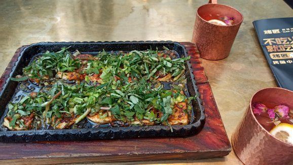 「桂花酸奶」这桂花酱汁酸奶,桂花香溢。超爱(⑉°з°)-♡ 「经典麻辣烤鱼」麻辣十足,里面的黑豆腐,滑嫩。吃得挺不下嘴。 点了一些爱吃的小吃,味道上也非常不错!烤鱼吃到后面有点咸了。 「烤鱿鱼须」嫩,香辣可口。 「包浆豆腐」外焦里嫩,和折耳根碎一起,很不错。 「菠萝小油条」吃起很清爽,菠萝酸甜,油条脆干十足。 「烤茄子」蒜蓉小米辣足,很很不错。 「芝士烤红薯」芝士和红薯融合,趁热吃超好吃。 「烤脑花」很入味,脑花细嫩。 「黑椒猪颈肉」这次我吃得最多串,嫩而多汁,口感十足。 「掌中宝」脆骨香,嚼劲好。