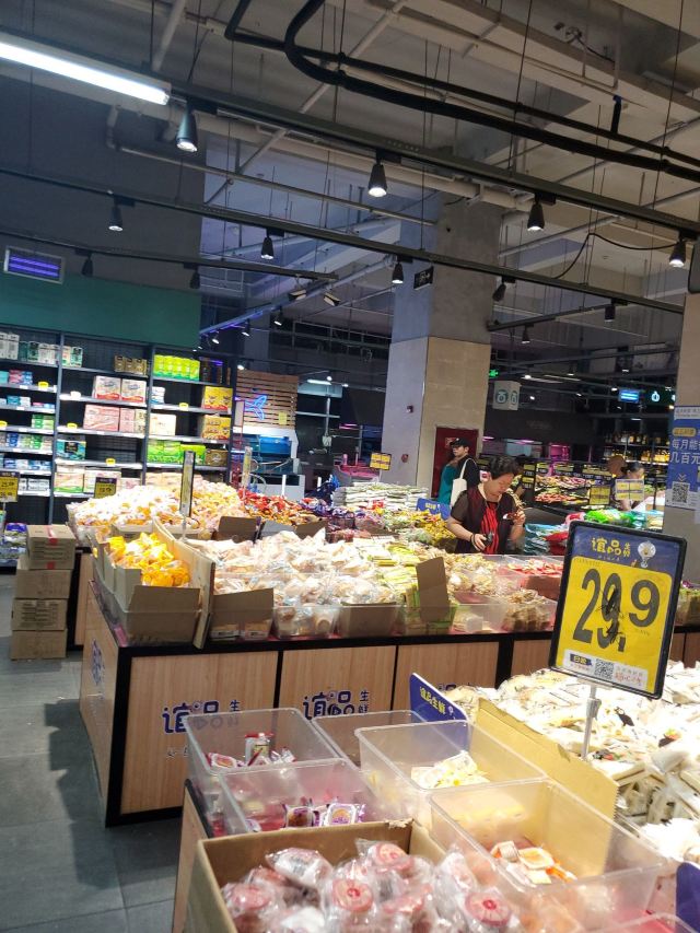 在附近的瓦罐鸡煲吃饭,吃完过后跑到这家谊品生鲜来买点菜,这家店在一个商业体的一层非临街铺面,店面不算大,可能400平米吧。装修的非常一般,陈列乱糟糟的,也许是晚上过来。菜品看起来也不行,卖肉的地方,灯光打的很红,看起来就不想买,太一般了。
