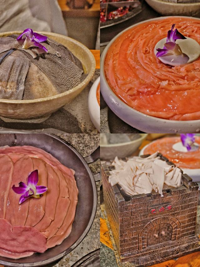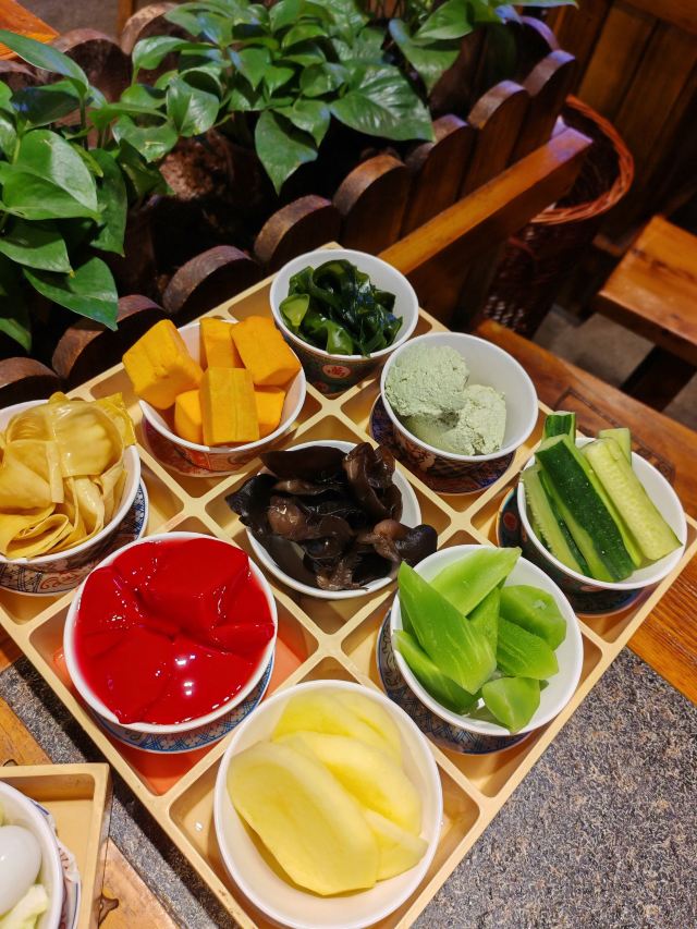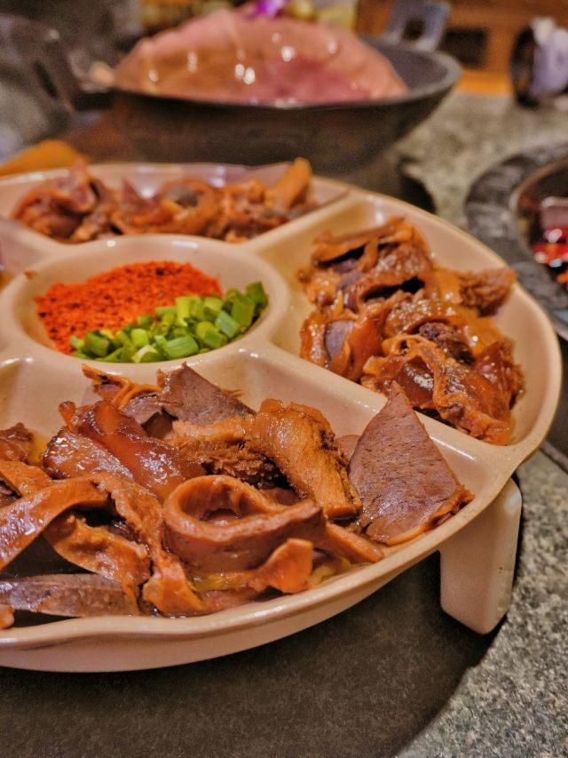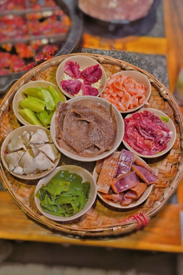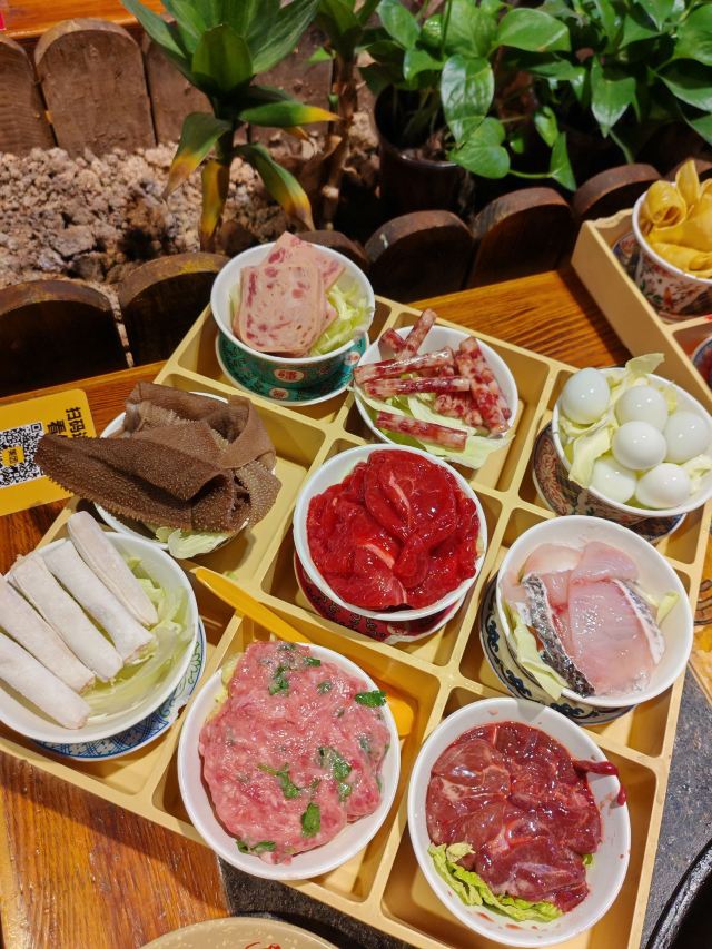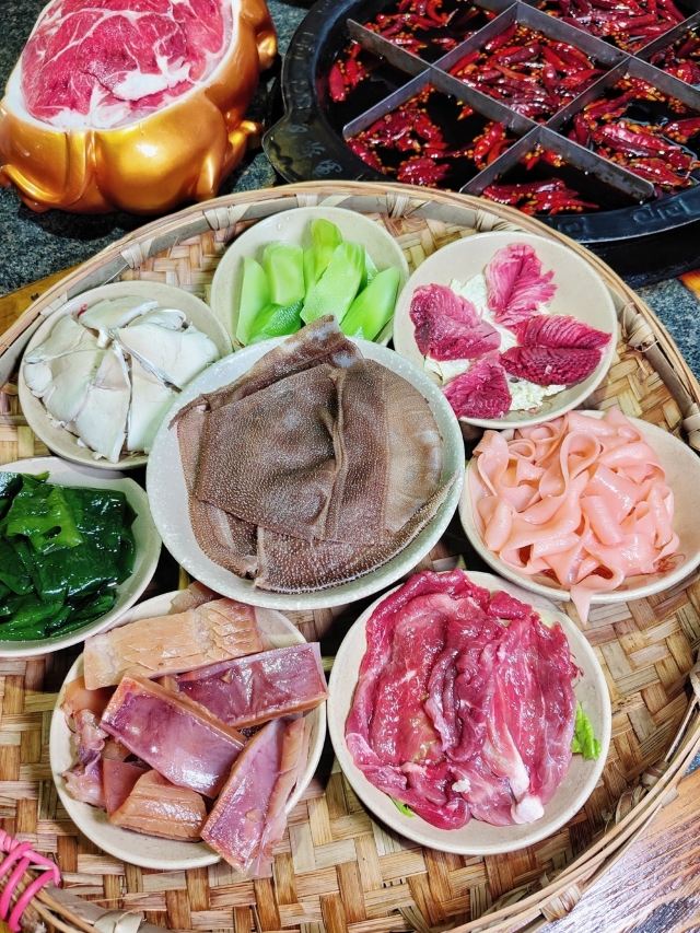 冷锅鸭血,屠场鲜毛肚,九尺鹅肠,军营炸酥肉,老肉片,鲜切黄牛肉,手工冰粉,红糖锅盔,军营大块肉,鱼籽福袋,霸王牛肉,油碟,土豆,将军大刀腰片,金针菇,鸭珺花,香菜丸子火锅便当单人餐,相间肥牛
