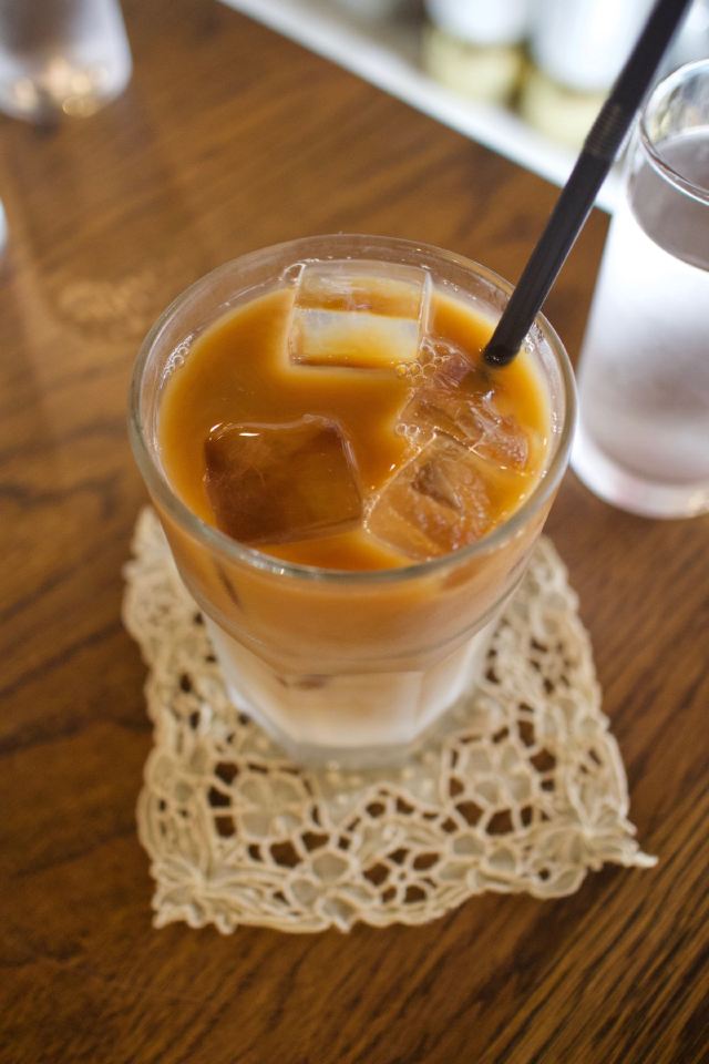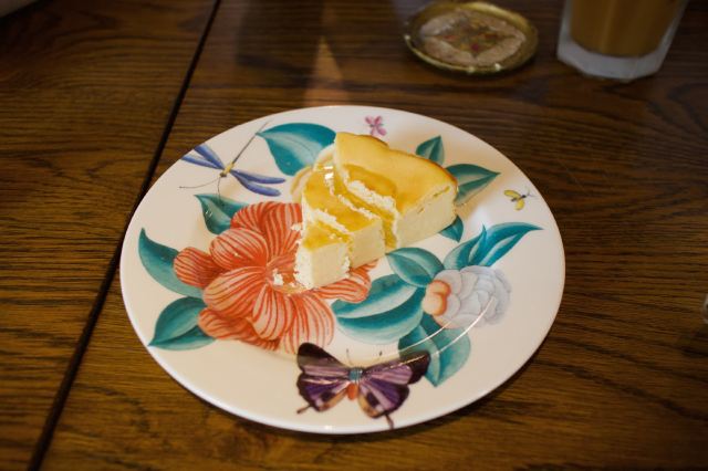 看见招牌很可爱就进去了。店里的墙上、天花板上、地上,都摆满了毛茸茸的干花。过了好一会儿,店主妹子才艰难地从一堆干花里探出了脑袋。 点了咖啡和芝士蛋糕。我举着小相机瞄着拿铁,刚对上焦,一转头朋友已经把蛋糕叉成了Wi-Fi。 急得我拔地而起,然后被干花扎到了脑瓜顶。起身去洗手间,去结账的时候,又被扎了两次脑瓜顶,好生气。 食物中规中矩,我点的冰拿铁比朋友的冰咖啡贵100日元。冰咖啡附带了一小杯牛奶,我们把它倒进了杯子里,你猜怎么着—— 它变成拿铁啦!
