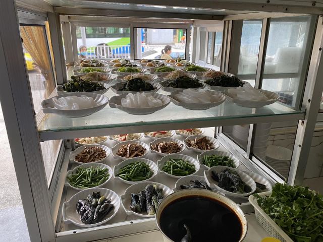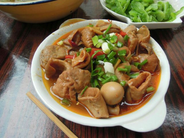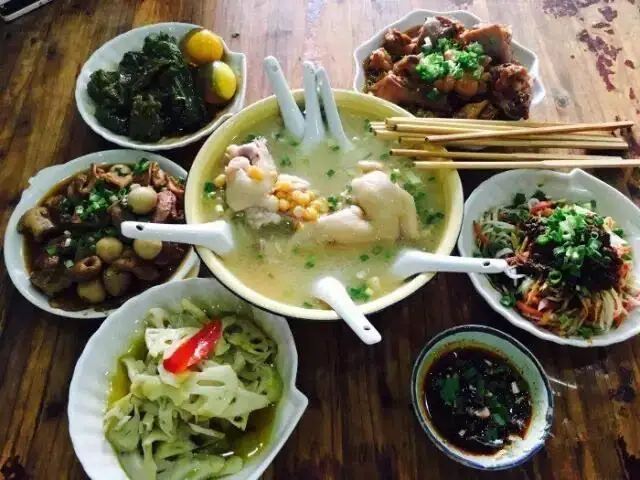 蹄花汤,红烧肥肠,烧白,红烧牛肉,青椒皮蛋,凉拌折耳根,豆花碟,芋儿汤,凉菜,红烧蹄花,川北凉粉,牛蹄筋,谅茄子,藕片,红烧蹄筋,豇豆,凉粉,米饭,萝卜丝,红烧排骨