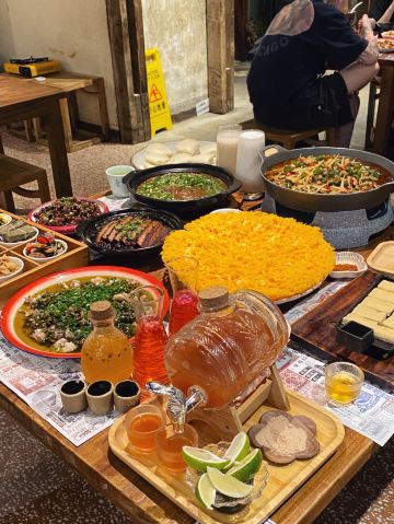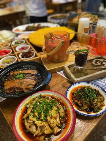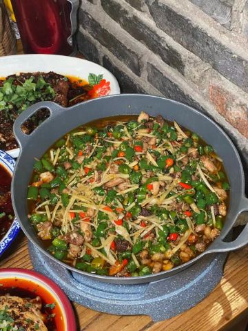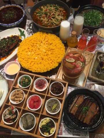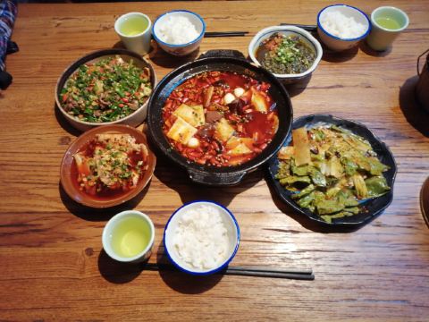 麻辣鸭肠,油淋豆腐,蒜泥白肉,腾椒鸡,活捉莴笋,耗儿鱼,豌豆汤,淋汁豆腐,梅子酒,藕丁,脑花,热酒,蕨根粉,凉拌蕨根粉,青梅酒,活作莴笋,凉拌折耳根,荔枝酒,枇杷酒,剁椒猪蹄,鸭肠,擂椒皮蛋,牛魔王草包牛肉,鲜椒蹄花,炝椒糊辣鱼,桃花酒,草包牛肉,糯米鸭,酸酸鸡,麻辣珺把,螃蟹,琵琶酒,凉三丝,凉拌藕片,豆瓣汤,酸菜豆瓣汤,折耳根,凉拌毛肚,酸菜胡豆瓣汤,黑牛肉,合作莴笋,兔丁,凉拌三丝,西兰花