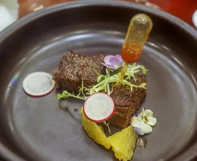 山城的神不在天际,在465路起点站——广电大厦对面的「厨界大饭店」里。 被切成敦实小方的高山黄牛肉,烧成后却以西餐的形式呈上,肉块上更扎着一枚装满鲜辣汁水的针剂,食用前需得将汁水挤入牛肉中心,切开再吃,每一根牛肉纤维里都浸满辣的丰盈,十分入味且无半分塞牙……
