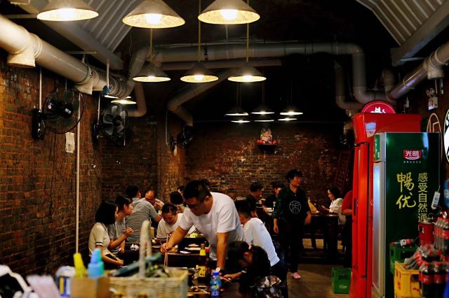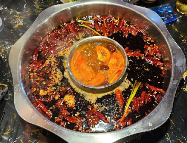 洞子外面各种植物遮住了防空洞,简直有点藏猫猫吃饭的感觉,一排排的简易照明灯下,防空洞的地道里面只能摆一长溜,冬暖夏凉,不管你怎么装修也弄不出这个特殊的味道和体验感。典型重庆黑色铸铁锅儿,大坨的牛油融化在里面,鸳鸯锅没球得、蚝油,重庆人不搞这一套。