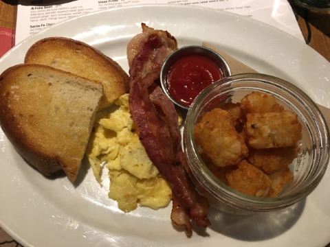 同样是位于Canada Place的Coal Harbour边,Tap&Barrel不如楼下的De Dutch那样有无边辽阔的海景,只在某些位置可见一点北温的雪山。周末中午提供Brunch,12:00前所有的Brunch都特价10刀。还有一款专门给儿童的Kid''s Brunch:bacon&egg。熏肉非常香,鸡蛋则乏善可陈。