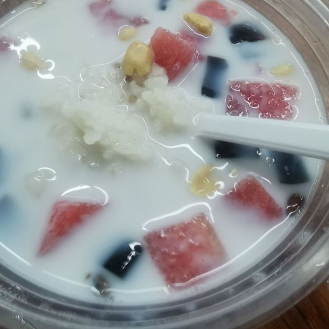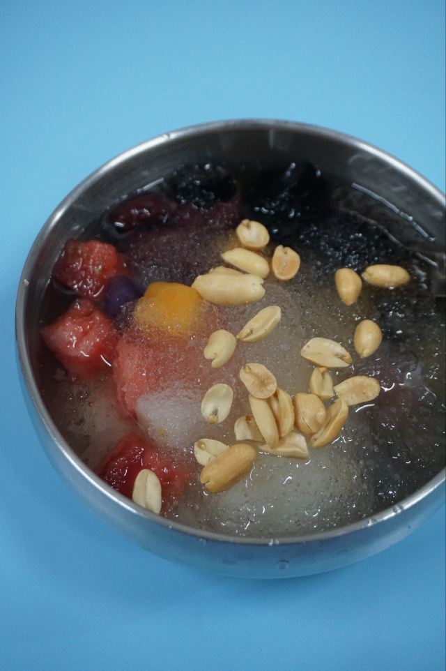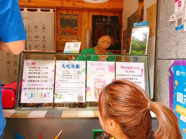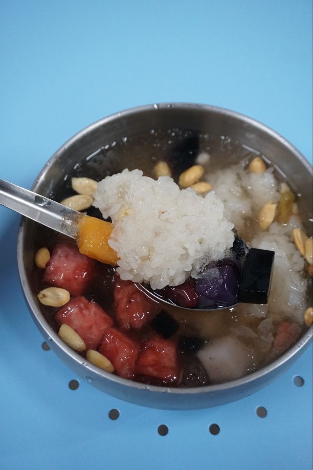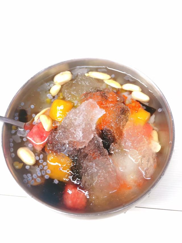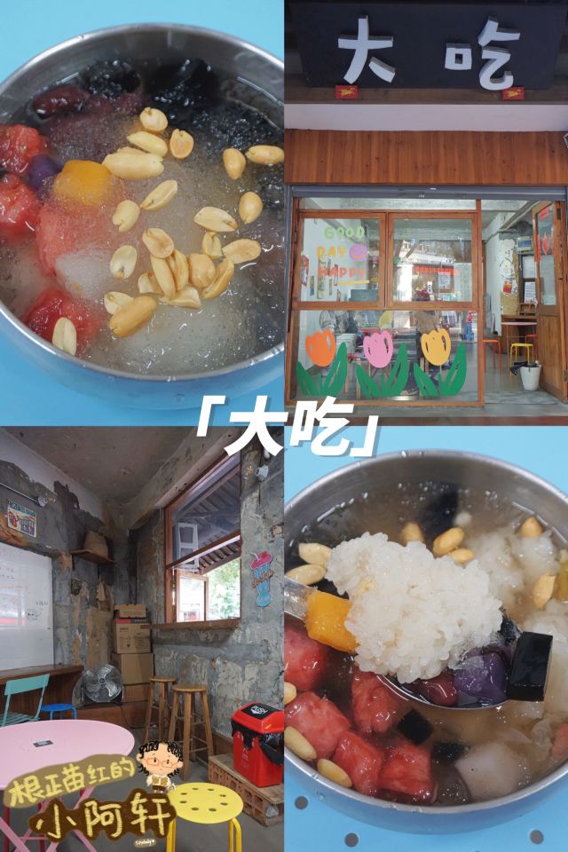 老冰棍味道的冰饭也是福州的特色小吃之一。糯米搭配着芋圆、水果、银耳、花生、凉粉、葡萄干和杂粮,天热的时候来一碗解暑又顶饱! 「大吃」在网上排行一直很高,是近些年福州甜品小吃类店铺里口碑还不错的。 除了各种味道的“冰饭”、“酒酿”和“豆花”,“四果汤”也是招牌。