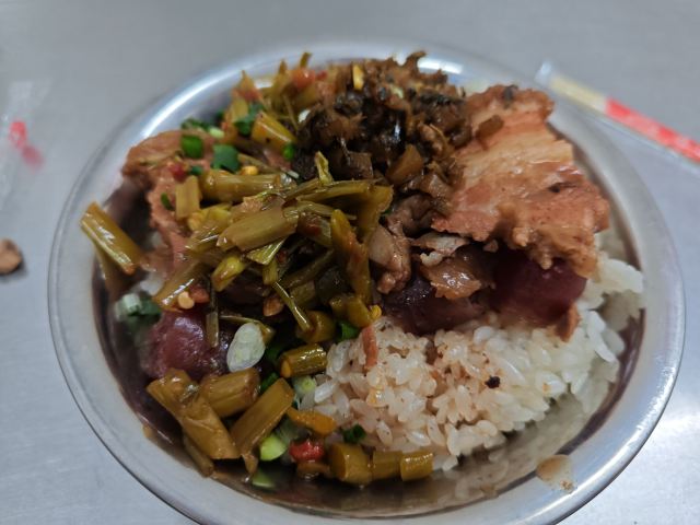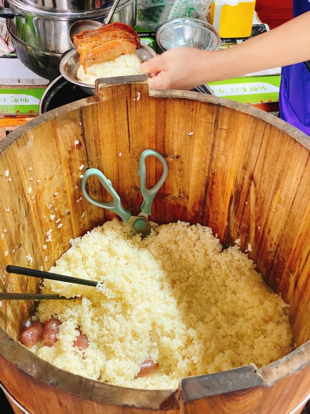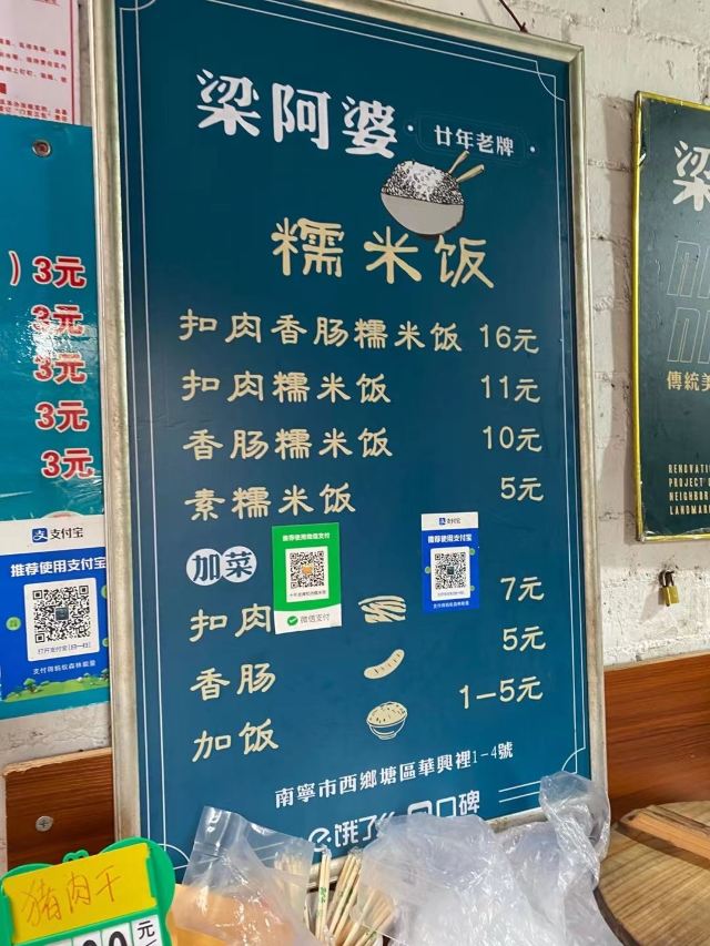 摩小亚这家糯米饭是我们此行南宁,最难忘也最怀念的一餐。 如果说,台北让我们眷念的是牛肉面和卤肉饭,那南宁就是这家梁阿婆扣肉糯米饭。 虽说南宁的糯米饭很出名,但是糯米饭真的吃这家就够,其他店只是用来论证我的这个观点的。 早点去,过了下午卖完就收摊,阿婆带着家人开了这个巷子里的小铺子,很简单很简陋。 准确的说它不算是是个铺面,就是一个路边摊而已,干干净净,座位不多,大家都是吃完就走,迎来一波又一波食客。 建议点一份10元的扣肉糯米饭,然后加一根5元的广味香肠,那样就完美了。 扣肉肥瘦刚好,软糯鲜美,厚切的口感特别赞,女孩子吃完这一片也是轻松的; 香肠略微回甜,嚼起来干香可口,和扣肉的搭配会更和谐哦; 糯米饭真的是每一颗都在放光,上桌前浇的那一勺扣肉酱汁,真的是点睛之笔,配上桌上的秘制咸菜,吃完一碗真的会想来多几碗。 旁边吃饭的大叔都在打趣,说专程跑很远过来吃这个卤肉饭,真想把阿婆的女儿娶回家,那样就可以天天在家吃到好吃的扣肉饭了。 哈哈哈,真是好主意。 早点去哦,卖完就收摊哦!
