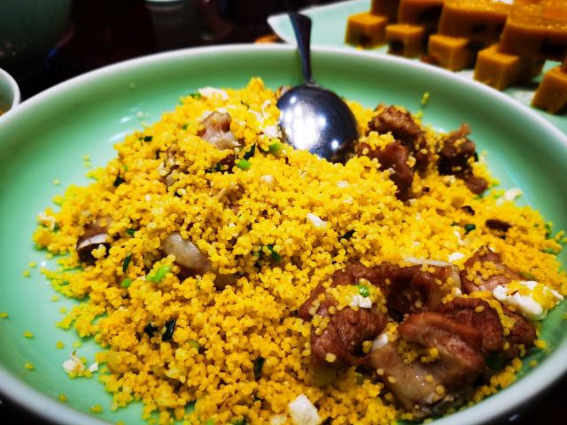 YIN XIANG GE山西菜馆,在太原当地比比皆是,数正宗论排名,河东颐祥阁绝对算上一家。还没进门,门口乌泱泱排了一遛人,还是大下雨天,可见其火爆。风葫芦、小米排骨、涮牛肚、过油肉、莜面扯面…那都是一绝,大麻花没想到是软的,不要太好吃哦…楼下是四人桌,楼上是大桌,环境还行,挡不住人多…