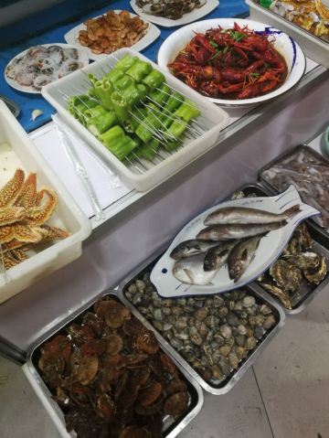 烤鸟贝,烤海星,海肠捞饭,蒜蓉生蚝,海胆蒸蛋,烤海肠,五花肉,面包,烤腰筋,小腰子一把,馒头,烤天鹅蛋,鲅鱼饺,香菇油菜,红烧茄子